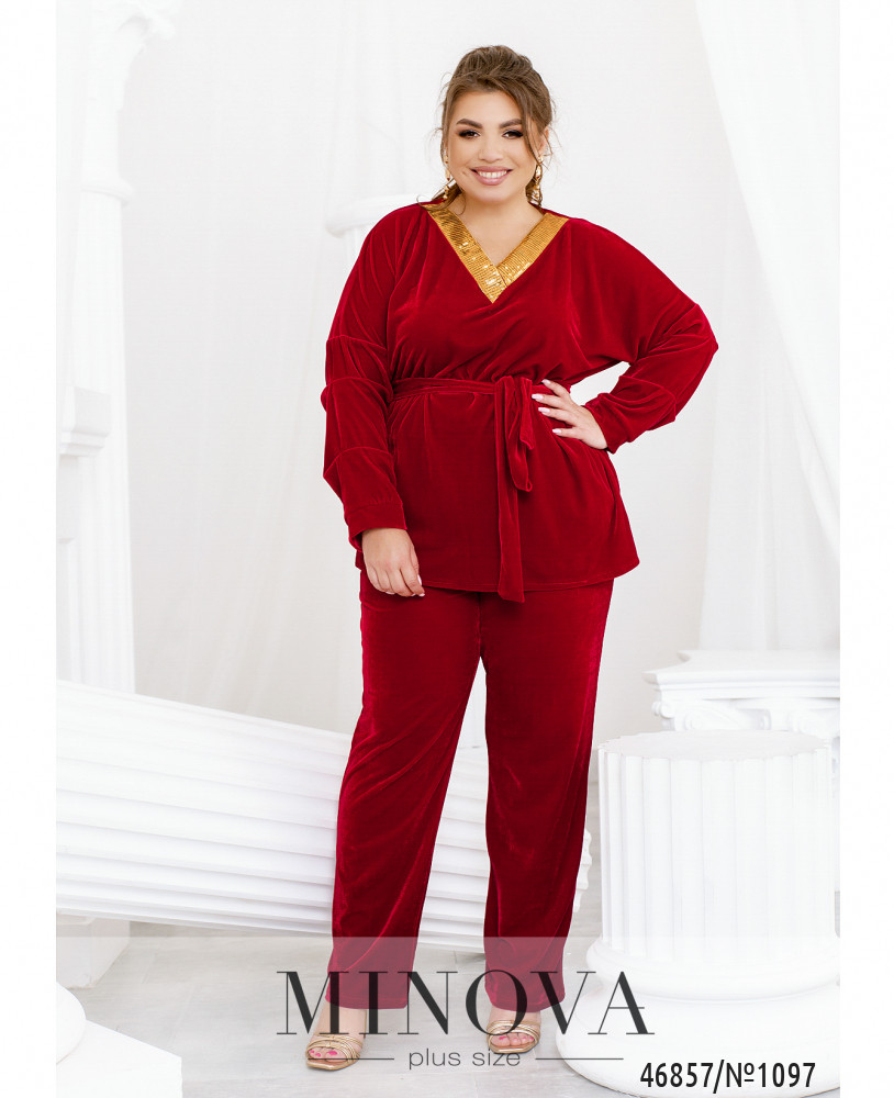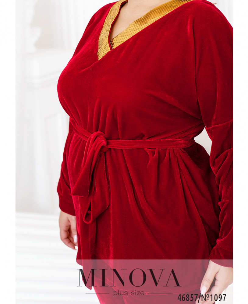 Яркий костюм, выполненный из мягкого велюра, подарит вам комфорт и придаст уверенности в своей неотразимости. В комплект входят лаконичные брюки на резинке с карманами и туника свободного кроя, украшенная сияющими пайетками в области горловины.