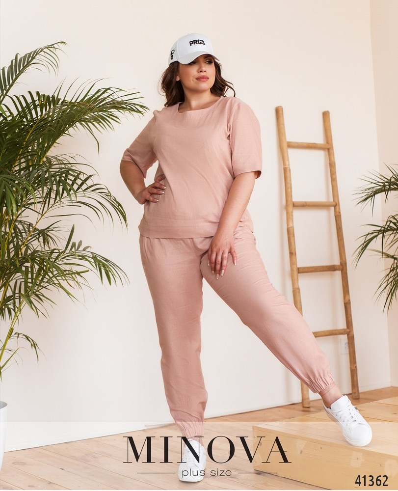Элегантный костюм батал с блузой и брюками. Блуза без застёжек и карманов, рукава без манжет, вырез горловины полукруглый, снизу на подоле - небольшая декоративная металлическая нашивка с названием бренда. Брюки с высокой талией, в пояс и в манжеты вшиты резинки, по бокам - врезные карманы.