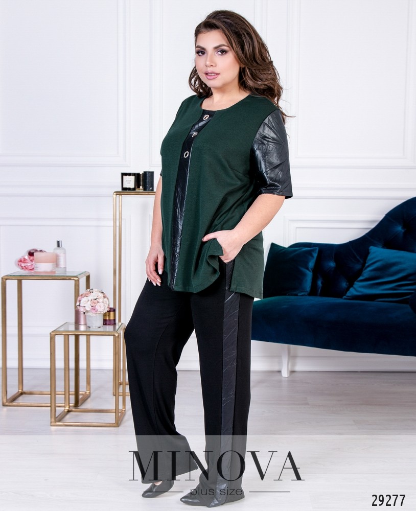 Костюм-двойка со вставками из эко-кожи. Костюм представлен свободной кофтой с короткими рукавами и прямыми брюками с лампасами. Расклешенная туника с разрезами по бокам. Рукава и декоративная планка изготовлены из эко-кожи. Планка украшена люверсами. Брюки с карманами украшены лампасами из эко-кожи. Пояс представлен резинкой.