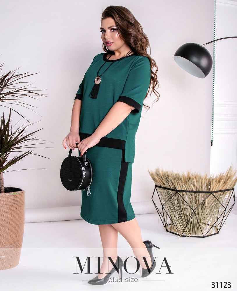 Костюм-двойка с юбкой. Прямая кофта с короткими рукавами и удлиненным подолом на спине. Подол и рукава оформлены контрастным кантом. Прямая юбка-труба оформлена лампасами по бокам. Пояс юбки оформлен плоской резинкой. К костюму прилагается подвеска.
