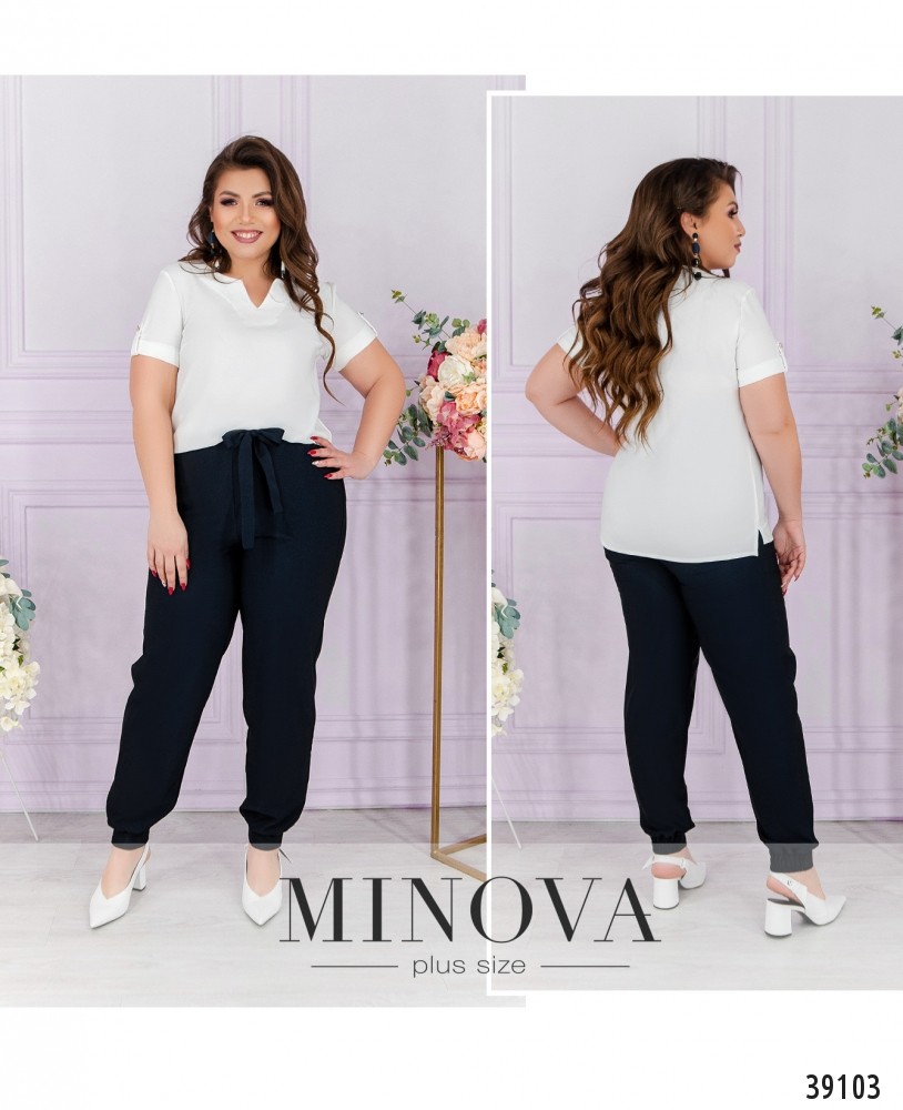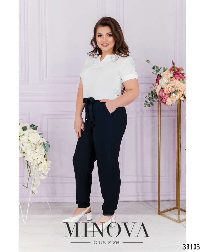 Удобный минималистичный повседневный костюм-двойка с брюками и блузой. Брюки с высокой посадкой, в пояс сзади вшита резинка, снизу - манжеты, в них также сзади вшита резинка. Спереди на талии подшит пояс. По бокам - врезные карманы. Блуза с вырезом горловины "фигурное каре", рукава с подворотами, фиксированными лентой, на груди вытачки, без застёжек и карманов.