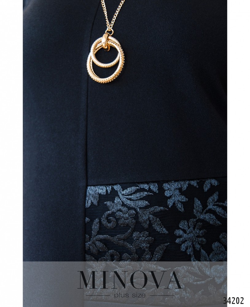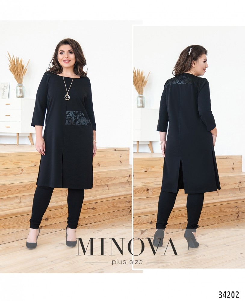 Очень нарядный и в то же время строгий костюм-двойка от Minova пригодится даже для соблюдения офисного дресс-кода, и особенно удачен будет для повседневного ношения: элементы декора делают его более праздничным. Кофта в виде платья, плечи, кокетка на спине и часть пояса слева украшены изящными гипюровыми накладками. Вырез горловины – фигурное каре. Рукава до локтя, свободные. Спереди и сзади на подоле по центру симметричные разрезы, добавляющие свободы движениям. В дополнение – длинная элегантная подвеска. На груди – вытачки, карманов и застёжек нет. Брюки без карманов, со вшитой на поясе резинкой. Очень удачный вариант для «прямоугольной» фигуры, можно носить с балетками или другой удобной, но лучше нарядной, обувью.