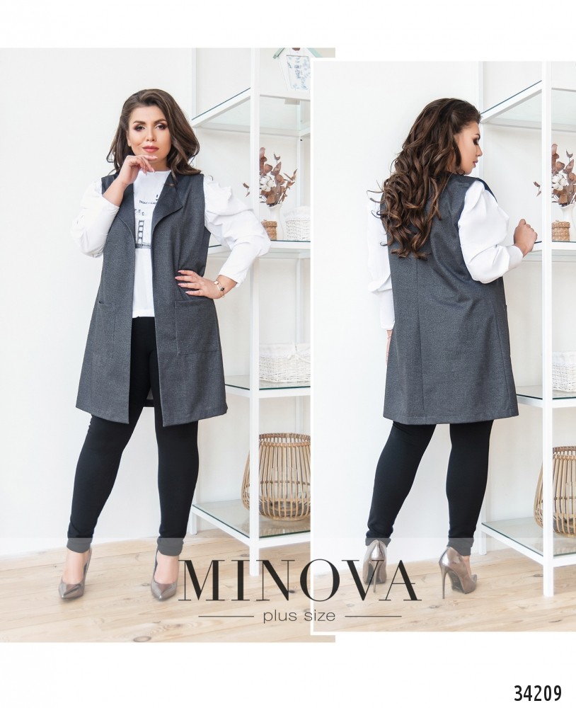 Стильный городской костюм прекрасно выглядит, если в его составе есть жилетка. В представленной в новом каталоге Minova модели костюм-двойка состоит из длинной жилетки и брюк. Жилетка из мягкой, но плотной ткани, с мягкими небольшими лацканами, а также в наличии два накладных кармана по бокам. Застёжек и пояса в комплекте нет, так что жилетка по фасону напоминает кардиган. Брюки из мягкой эластичной ткани, со вшитой в пояс резинкой и карманами по бокам. Костюм можно дополнить яркими аксессуарами и удобной обувью. В каталоге представлены однотонные модели и модель с неброским принтом на сером фоне.
