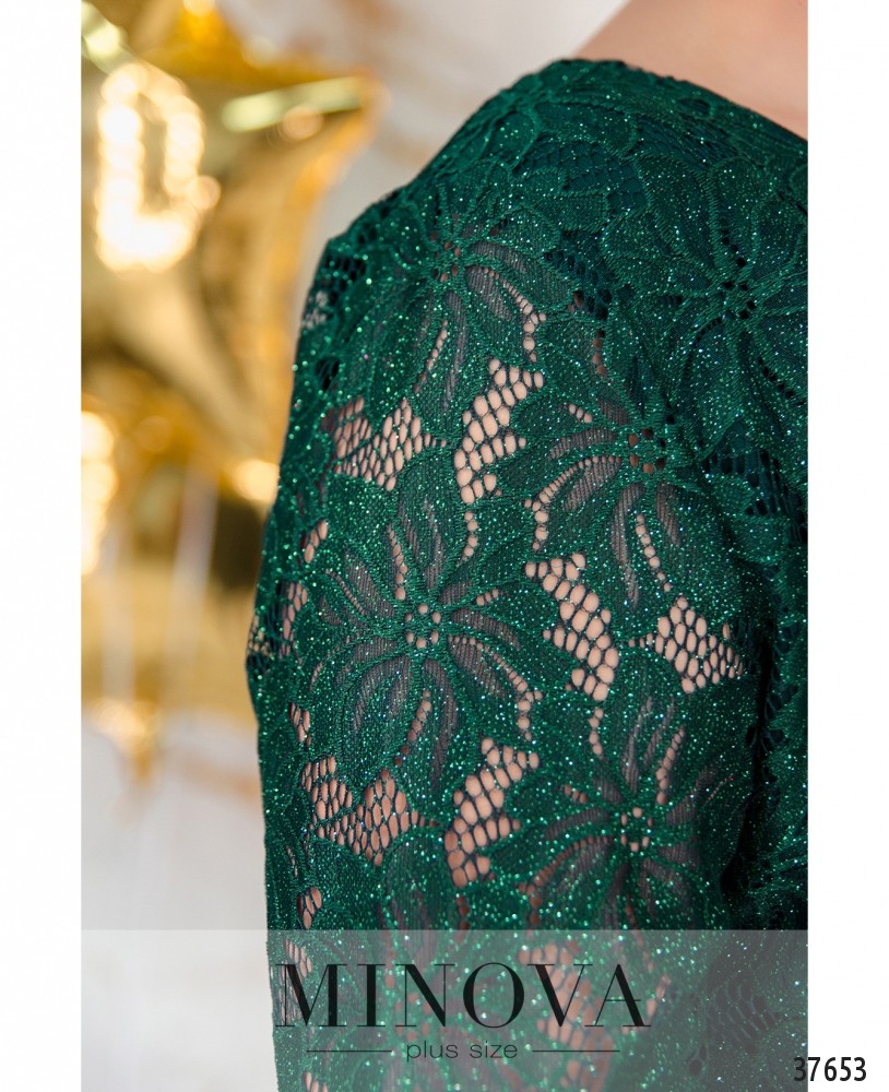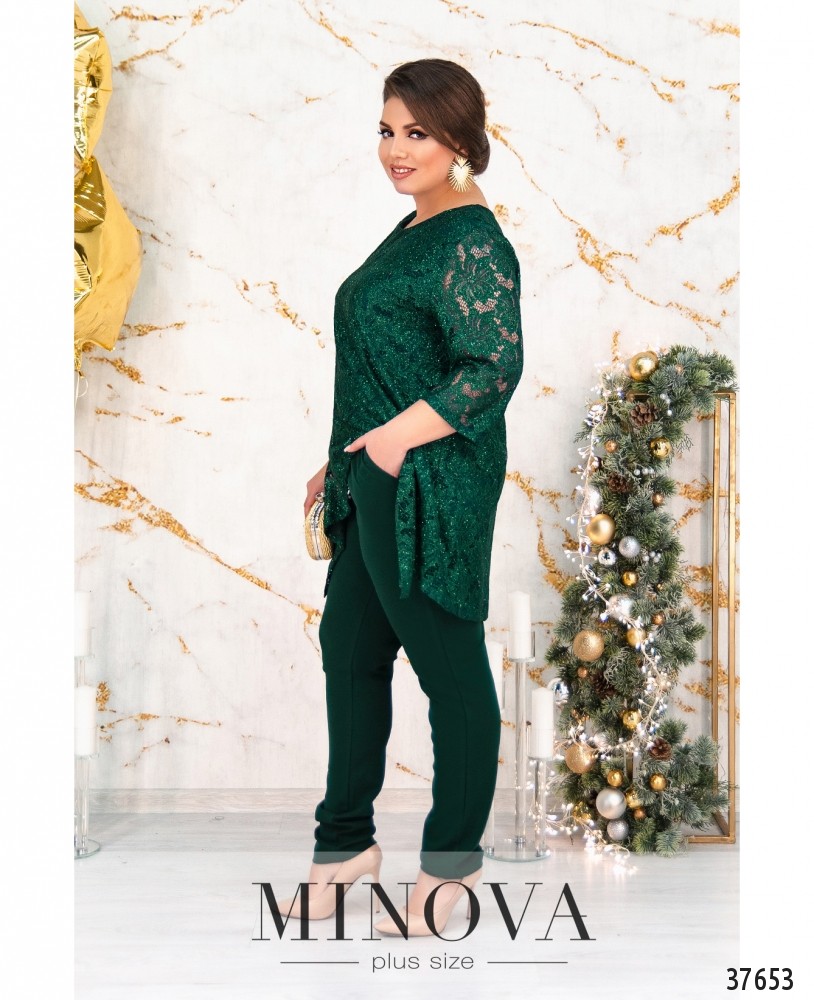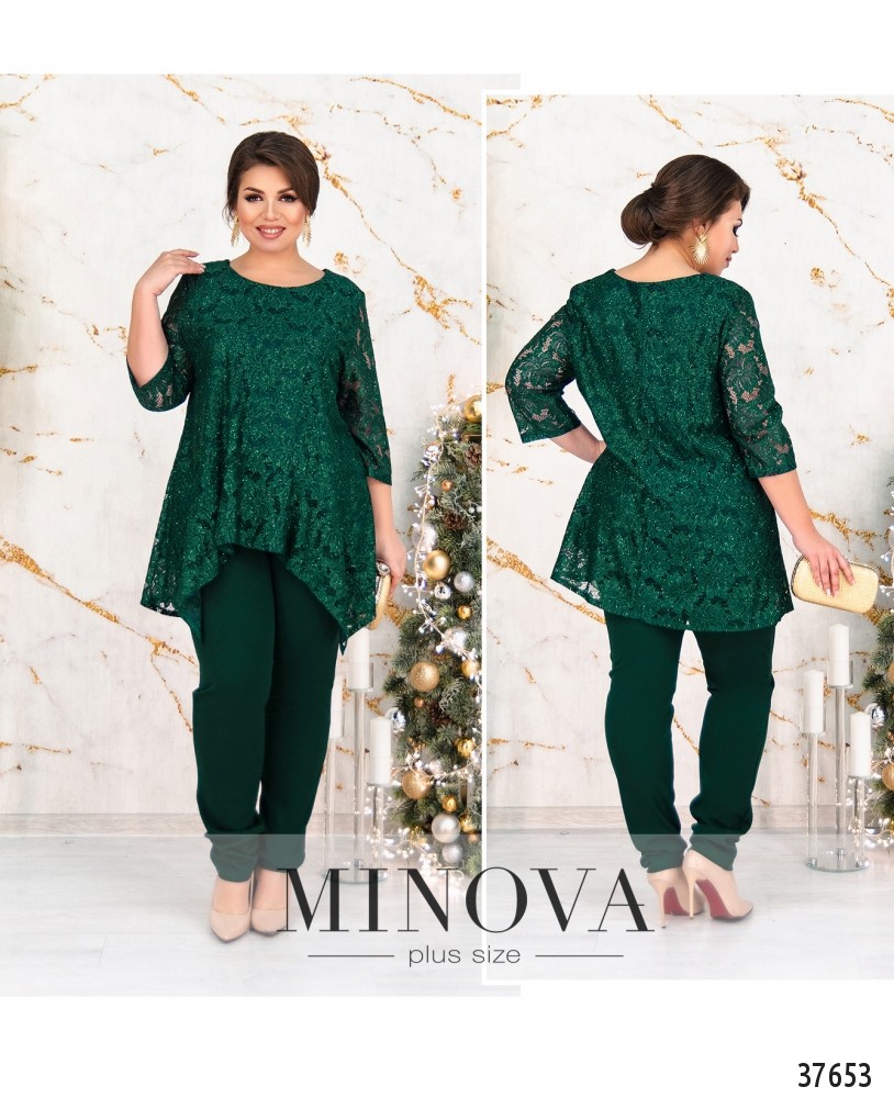 Нарядный костюм-двойка с блузой и брюками. Блуза с вырезом горловины «лодочкой», подкладкой и кружевом, рукава без подкладки, кружевные. Подол блузы асимметричный: спереди короче, а подкладка ещё более короткая. По спинке длиннее. На кружеве блёстки. Брюки высокой посадки, прямого кроя, со вшитой в пояс резинкой и прорезными карманами, без манжет.