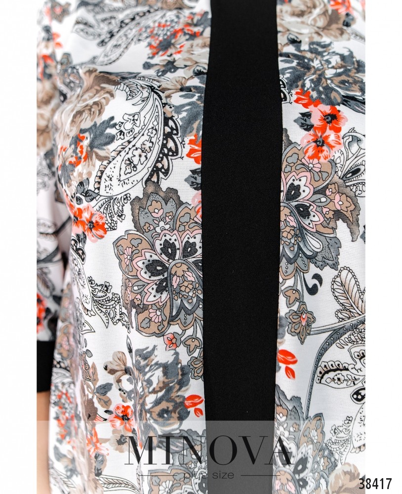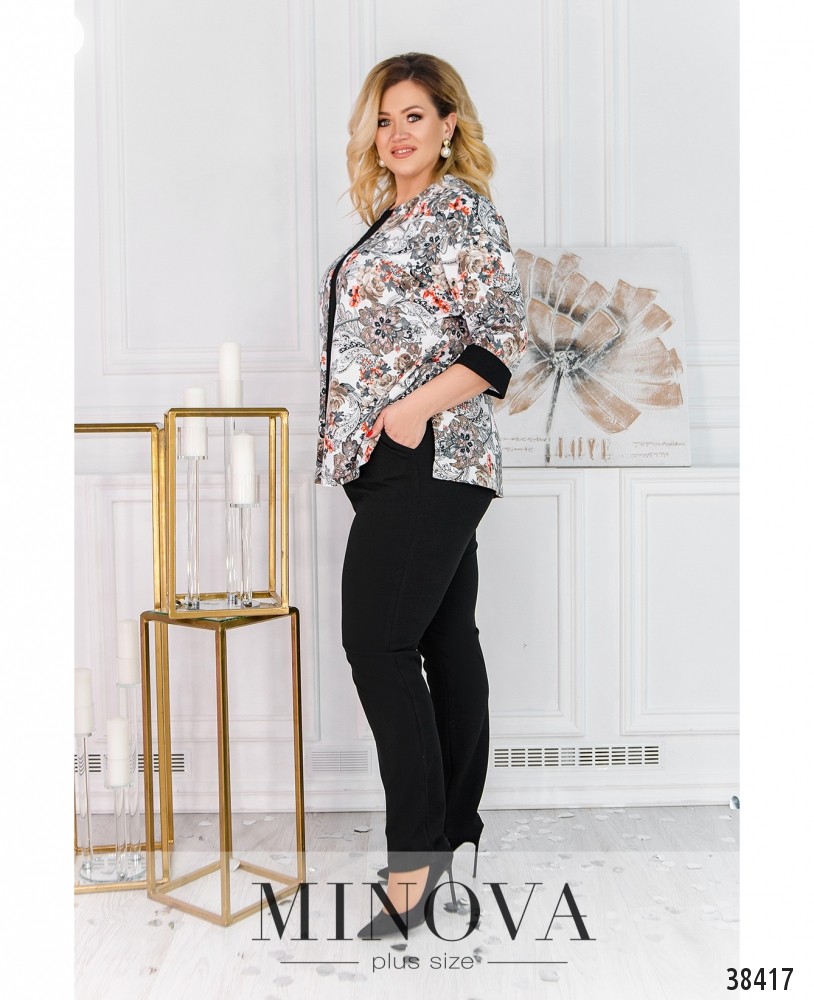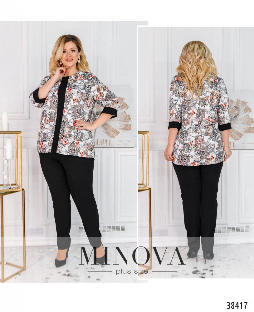 Нежный костюм-двойка батал с длинной блузой и брюками. Брюки с высокой талией, в пояс вшита резинка, по бокам - врезные карманы. Блуза без застёжек и карманов, по бокам на подоле - разрезы, рукава с контрастными манжетами.