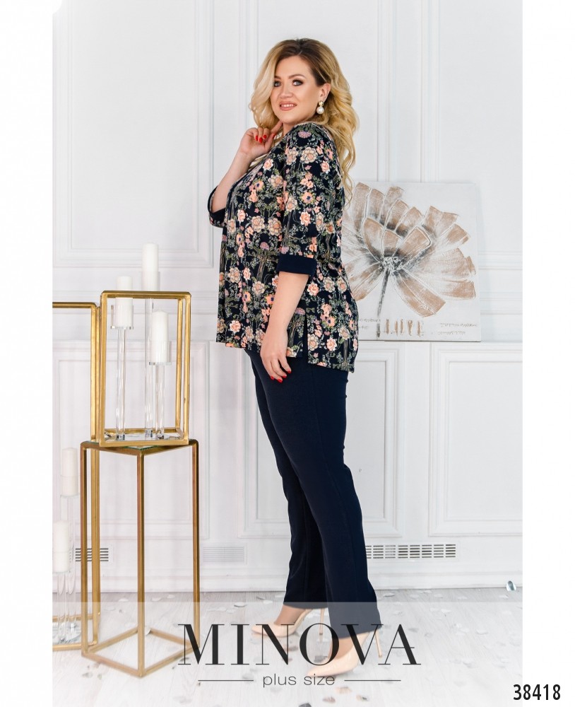 Нежный костюм-двойка батал с длинной блузой и брюками. Брюки с высокой талией, в пояс вшита резинка, по бокам - врезные карманы. Блуза без застёжек и карманов, по бокам на подоле - разрезы, рукава с контрастными манжетами.