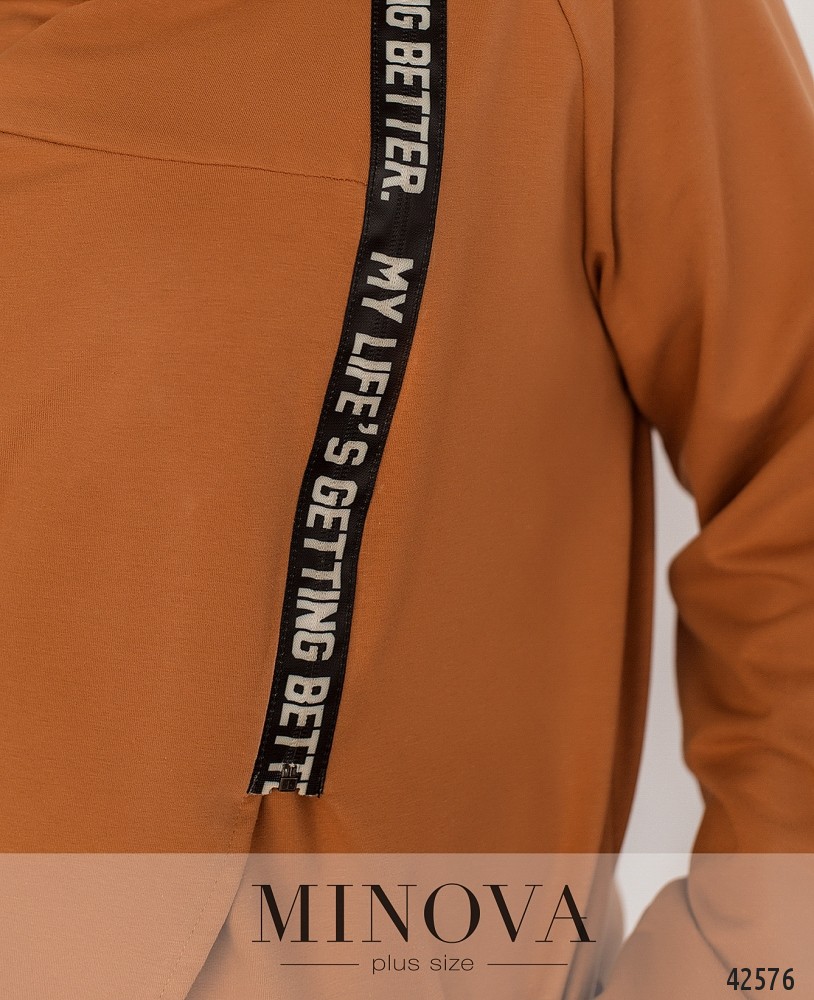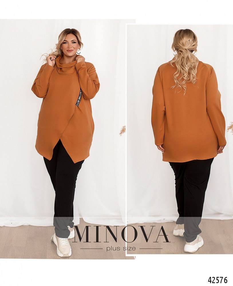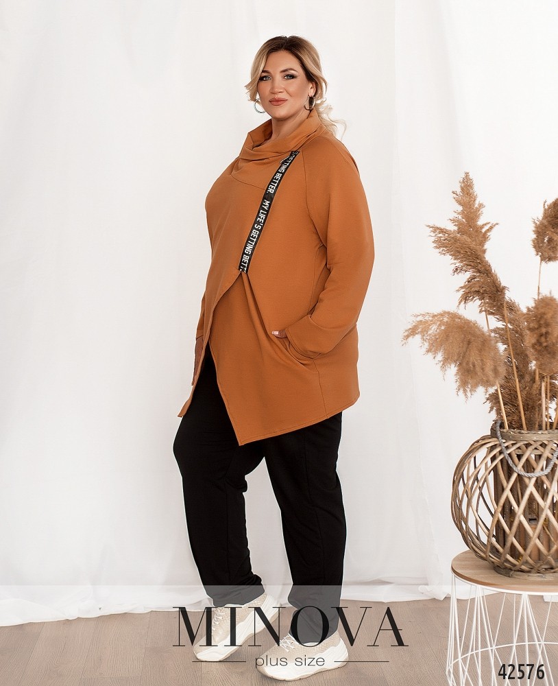 Яркий и удобный костюм-двойка батал. В комплекте - пончо с декоративной змейкой под лентой, и с рукавами. Рукава без манжет. Воротник-хомут. Застёжек нет, по бокам врезные карманы. Брюки с высокой талией и карманами по бокам, в пояс вшита резинка.