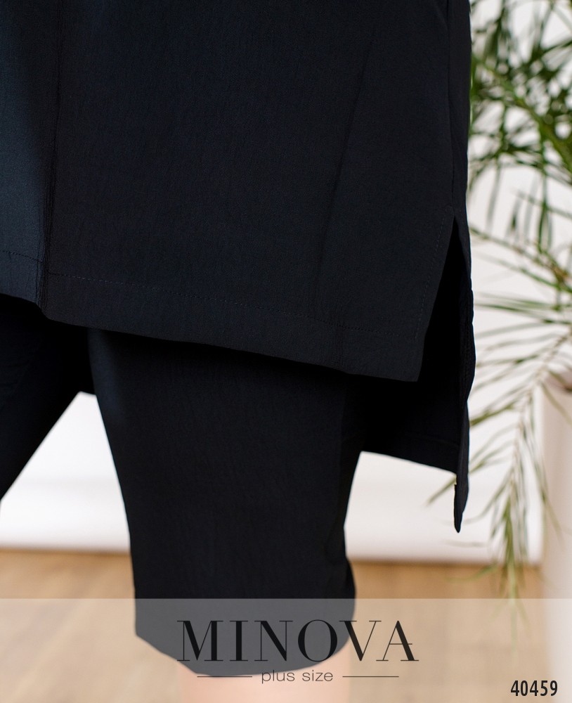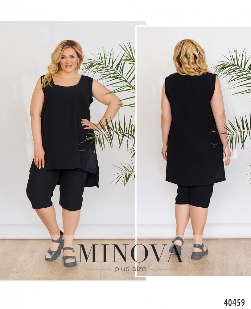 Лёгкий и удобный, минималистичный повседневный костюм с блузой и укороченными брюками. Брюки с высокой талией, в пояс вшита резинка, карманов и застёжек нет. Блуза с широким вырезом горловины, без рукавов, подол асимметричный, по спинке длиннее, по бокам разрезы. Застёжек и карманов нет.