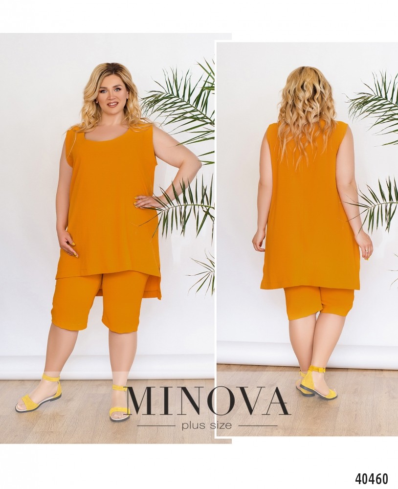 Лёгкий и удобный, минималистичный повседневный костюм с блузой и укороченными брюками. Брюки с высокой талией, в пояс вшита резинка, карманов и застёжек нет. Блуза с широким вырезом горловины, без рукавов, подол асимметричный, по спинке длиннее, по бокам разрезы. Застёжек и карманов нет.