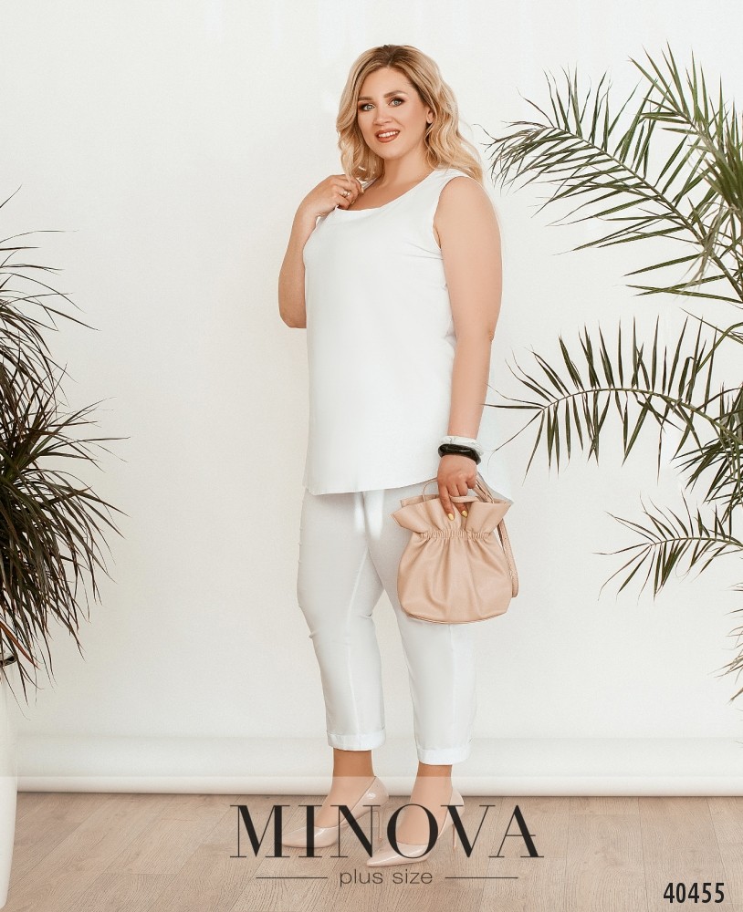 Минималистичный, очень удобный костюм-двойка батал со свободной блузой и с укороченными брюками. Блуза с широким полукруглым вырезом горловины, подол асимметричный, по спинке чуть длиннее. По бокам подола - разрезы. Застёжек и карманов нет. Брюки укороченные, в пояс вшита резинка, без застёжек и карманов, без манжет. Украшение входит в комплект.