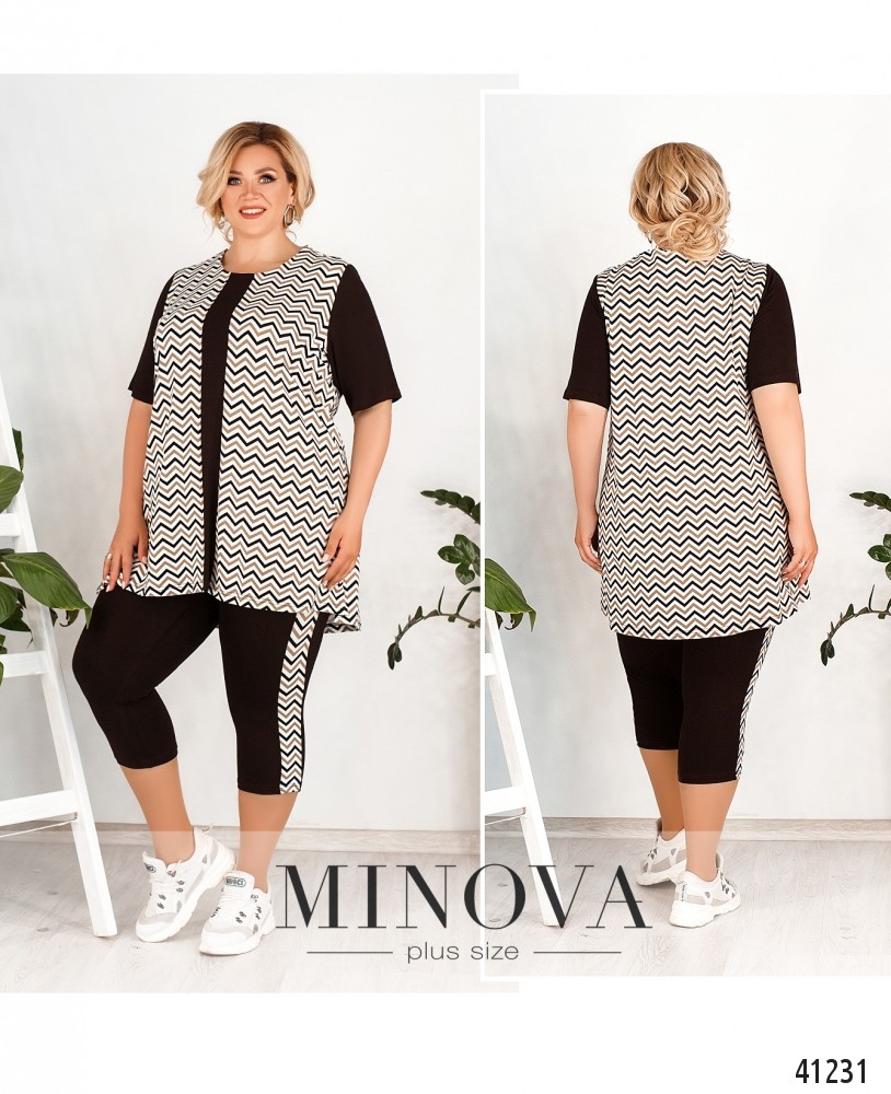 Яркий и оригинальный костюм-двойка батал с брюками и туникой. Туника с разрезами по бокам подола, без застёжек и карманов, рукава без манжет, вырез горловины полукруглый, на груди вытачки. Брюки со вшитой в пояс резинкой, без карманов, с лампасами.