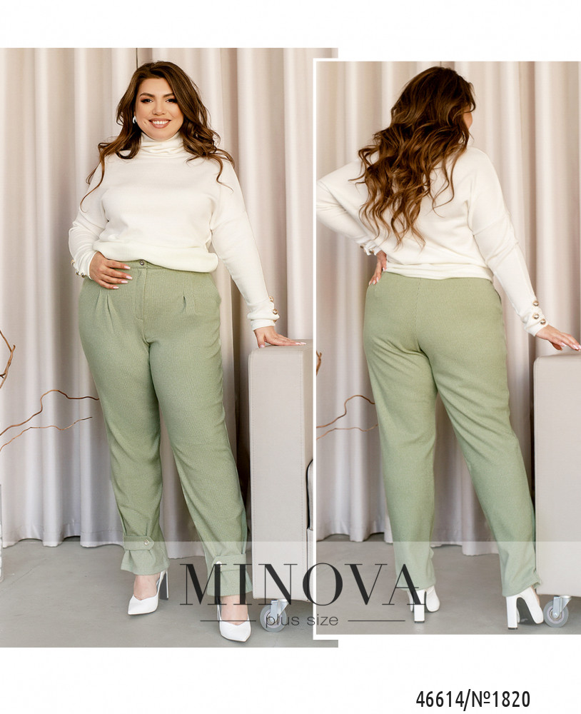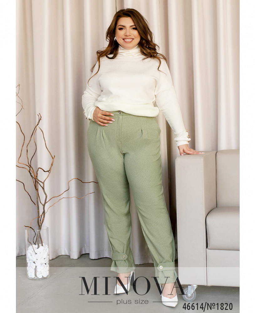 Стильный костюм, выполненный из мягких тканей, позволит вам в любую погоду и время года выглядеть женственно и привлекательно. Изюминкой данного комплекта являются выразительные брюки, застёгивающиеся на змейку и пуговицу, с декоративным  хлястиком, стягивающим низ штанины спереди. Костюм идеально дополняет лаконичный однотонный гольф с пуговицами на рукавах.