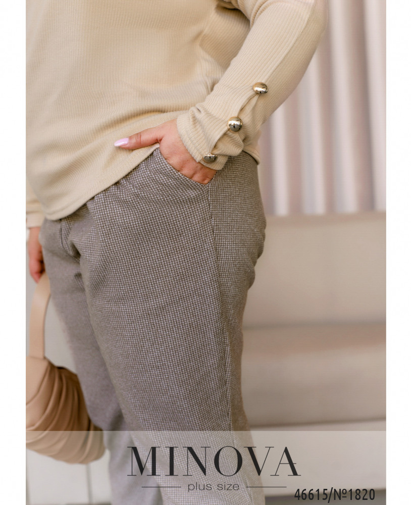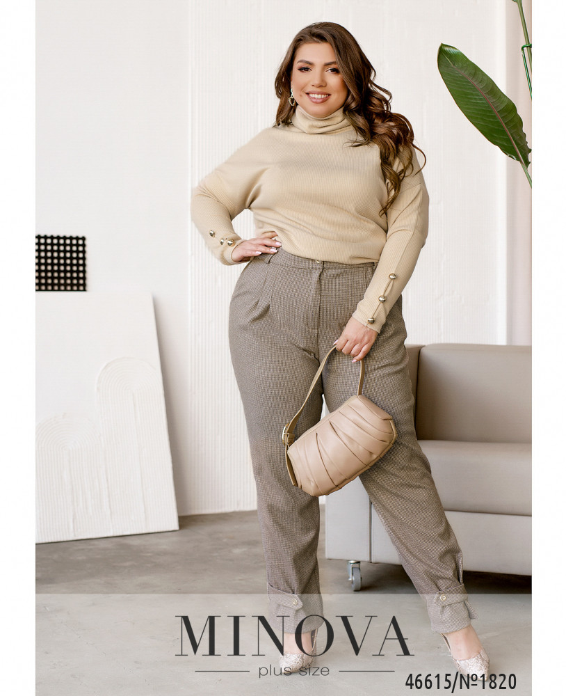 Стильный костюм, выполненный из мягких тканей, позволит вам в любую погоду и время года выглядеть женственно и привлекательно. Изюминкой данного комплекта являются выразительные брюки, застёгивающиеся на змейку и пуговицу, с декоративным  хлястиком, стягивающим низ штанины спереди. Костюм идеально дополняет лаконичный однотонный гольф с пуговицами на рукавах.