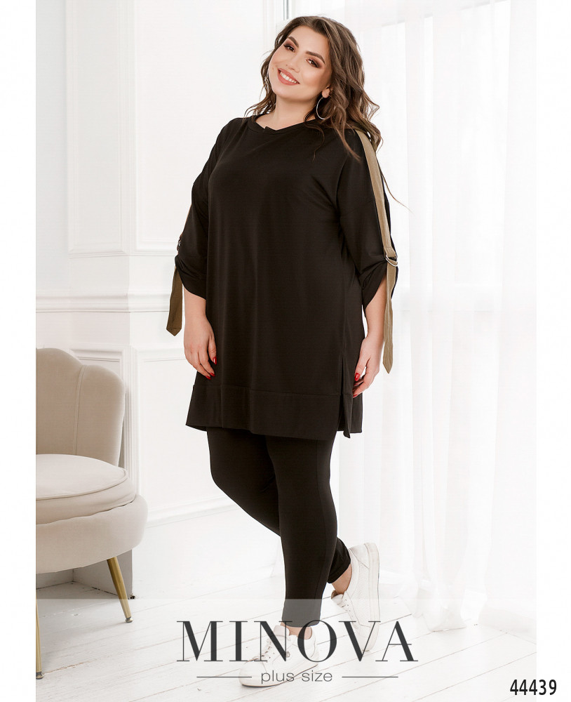 Стильный костюм-двойка батал, блуза с лацканами из ленты, которая оканчивается двумя металлическими полукольцами. Внутри рукава подшита такая же лента, так что длину рукава можно регулировать. Вырез горловины полукруглый, застёжек и карманов нет, подол с подшитым манжетом, крой свободный, по бокам подола - разрезы. Брюки фасона "лосины", в пояс вшита плотная резинка, карманов и застёжек нет.