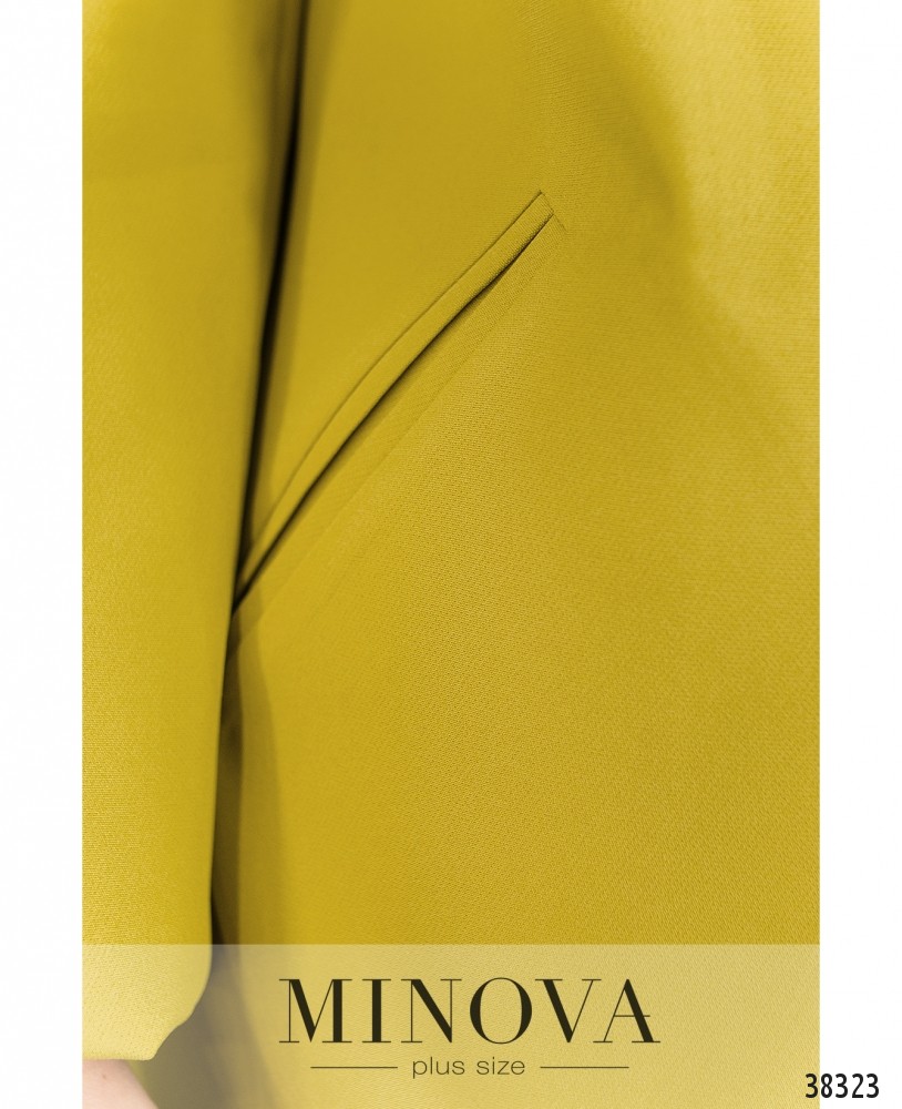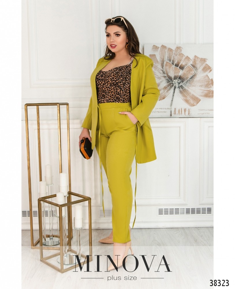 Привлекательный и женственный деловой костюм-двойка большого размера. Жакет без застёжек, на завязках, по бокам – врезные карманы. В наличии подплечники, подкладки нет. Брюки с декоративными швами-«стрелками», в пояс сзади вшита резинка, по бокам – врезные карманы, застёжек нет, есть декоративная ширинка.