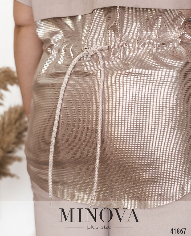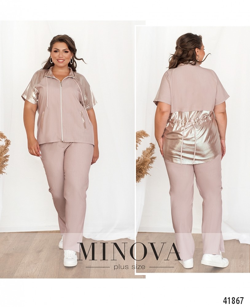 Стильный и очаровательный костюм-двойка большого размера. Свитшот с молнией по центру, с воротником-стоечкой, через который пропущен шнурок. Спинка разделена пополам, через талию также пропущен шнурок, длина асимметричная. Рукава, клапаны на карманах и воротник контрастные, блестящие. Брюки с высокой талией, в пояс сзади вшита резинка, в наличии декоративная ширинка, по бокам - врезные карманы. По бокам брючин снизу - длинные разрезы.