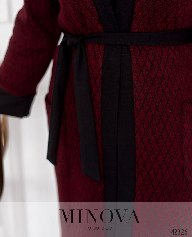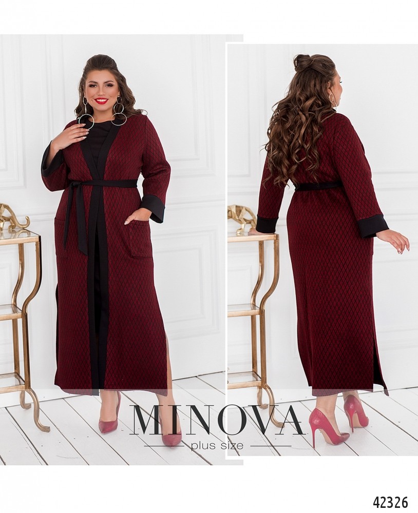 Мягкий и очень комфортный костюм батал. Платье застегивается на потайную змейку по спинке, на груди и на спине вытачки, вырез горловины полукруглый, в комплекте пояс в тон. Кардиган с накладными карманами, по бокам подола - длинные разрезы. Подкладки и застёжек нет. Пояс/аксессуар входит в комплект.