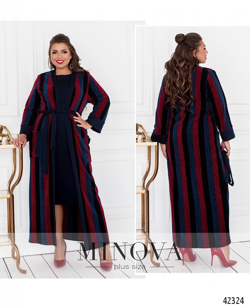 Мягкий и очень комфортный костюм батал. Платье застегивается на потайную змейку по спинке, на груди и на спине вытачки, вырез горловины полукруглый, в комплекте пояс в тон. Кардиган с накладными карманами, по бокам подола - длинные разрезы. Подкладки и застёжек нет. Пояс/аксессуар входит в комплект.
