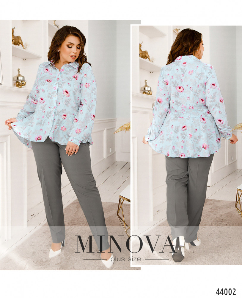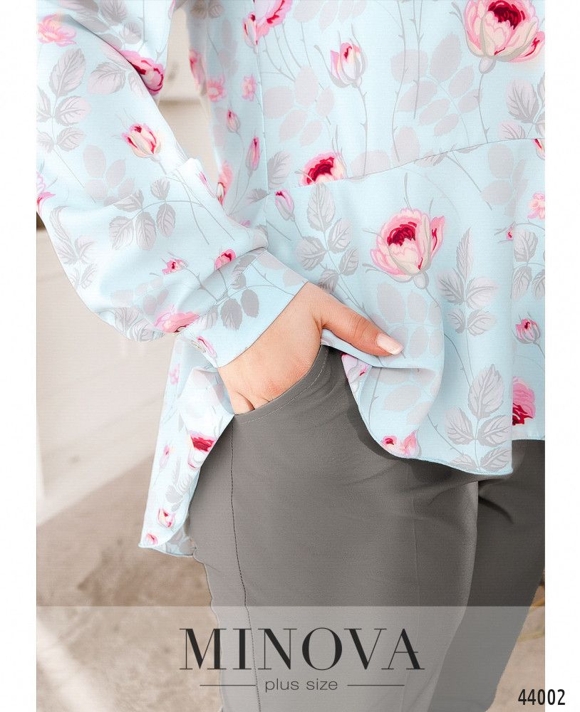 Изысканный костюм батал с блузой и брюками. Блуза с очаровательным цветочным принтом, с оборками внизу подола. Без карманов, воротничок отложной, на манжетах - по одной пуговке. Застёжка - ряд пуговиц спереди на планке. На груди вытачки. Брюки с карманами в шве по бокам, в пояс сзади вшита резинка, спереди - декоративная ширинка, посадка высокая.