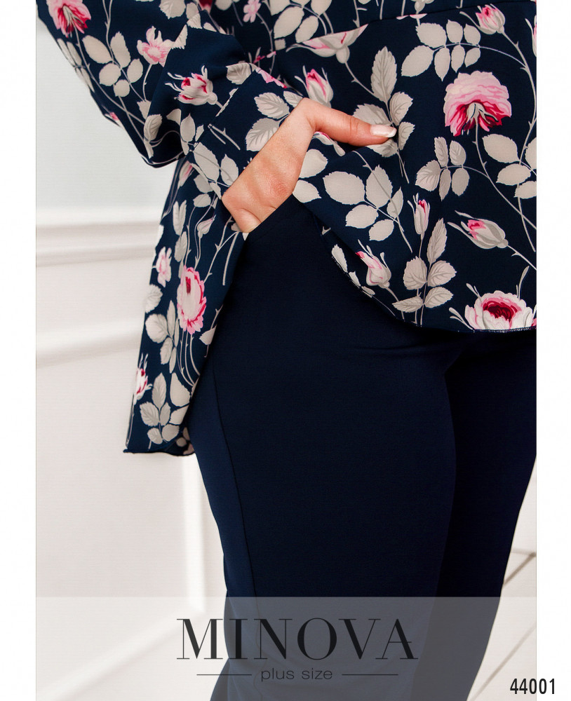 Изысканный костюм батал с блузой и брюками. Блуза с очаровательным цветочным принтом, с оборками внизу подола. Без карманов, воротничок отложной, на манжетах - по одной пуговке. Застёжка - ряд пуговиц спереди на планке. На груди вытачки. Брюки с карманами в шве по бокам, в пояс сзади вшита резинка, спереди - декоративная ширинка, посадка высокая.