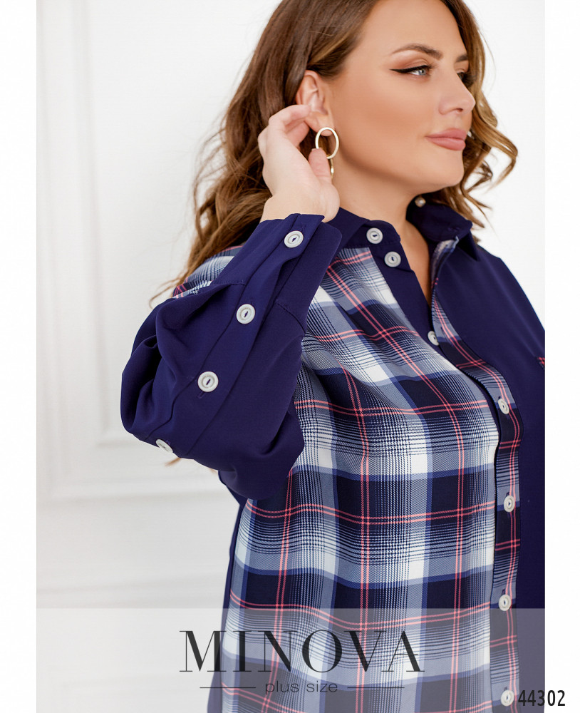 Яркий, стильный и привлекательный костюм двойка батал. Рубашка с контрастной полочкой, кокеткой и накладным карманом на груди. На рукавах - плотные манжеты, на них по четыре пуговки. Застёгивается рубашка на ряд пуговиц спереди на планке. Воротничок отложной. Спинка чуть длиннее, по бокам подола небольшие разрезы. Брюки с высокой талией, в пояс вшита резинка, по бокам карманы в шве.