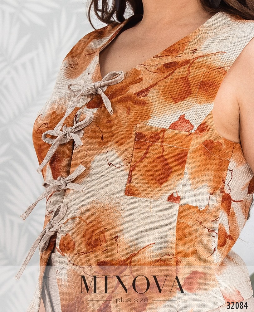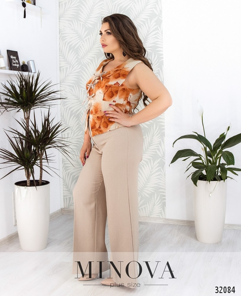 Брючный костюм-двойка с цветной жилеткой. Жилетка завязывает на канатики вдоль планки на лицевой стороне. Прямые брюки со стрелками. Брюки на высокой талии с поясом-планкой, застегивают на пуговицу и молнию.