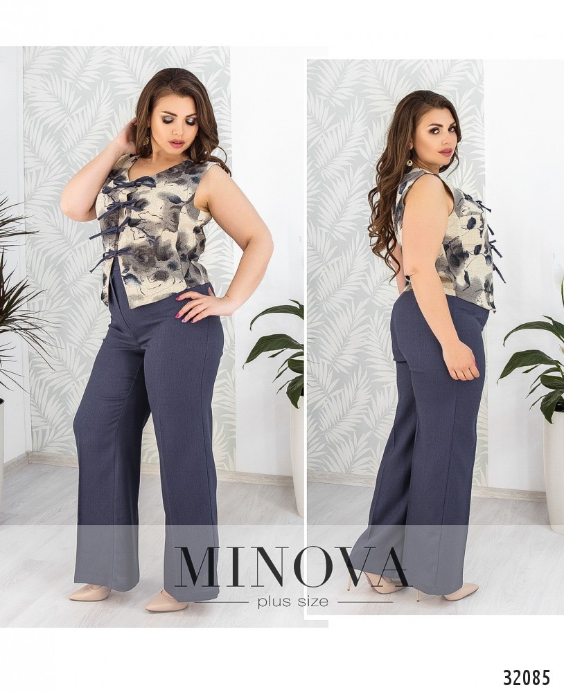 Брючный костюм-двойка с цветной жилеткой. Жилетка завязывает на канатики вдоль планки на лицевой стороне. Прямые брюки со стрелками. Брюки на высокой талии с поясом-планкой, застегивают на пуговицу и молнию.