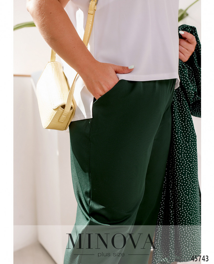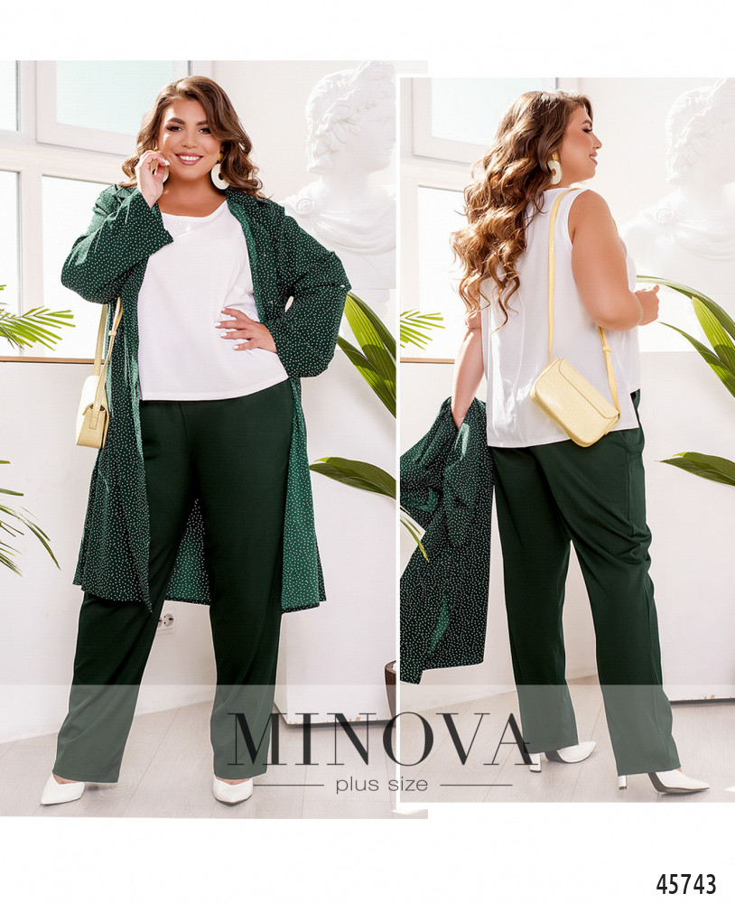 Яркий летний костюм-тройка – универсальное решение для любой модницы. В комплект входят брюки прямого кроя на резинке с карманами в боковых швах, выполненные из однотонной ткани, лаконичная белая майка и невесомая рубашка с актаульным принтом в горошек и рукавами длиной 3/4.