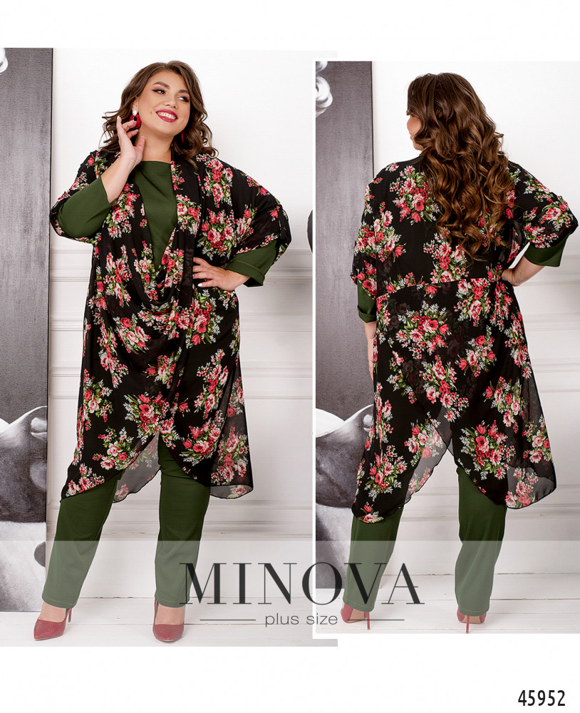 Яркий оригинальный костюм создает не только красоту, уверенность и комфорт, но и подчеркивает ваш индивидуальный стиль. Монохромный минималистичный костюм-двойка, состоящий из блузы с длинными рукавами и брюк прямого кроя на резинке с карманами в боковых швах, дополнен яркой накидкой свободного кроя с манжетами.