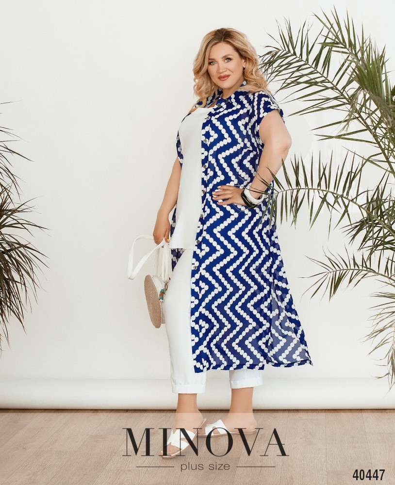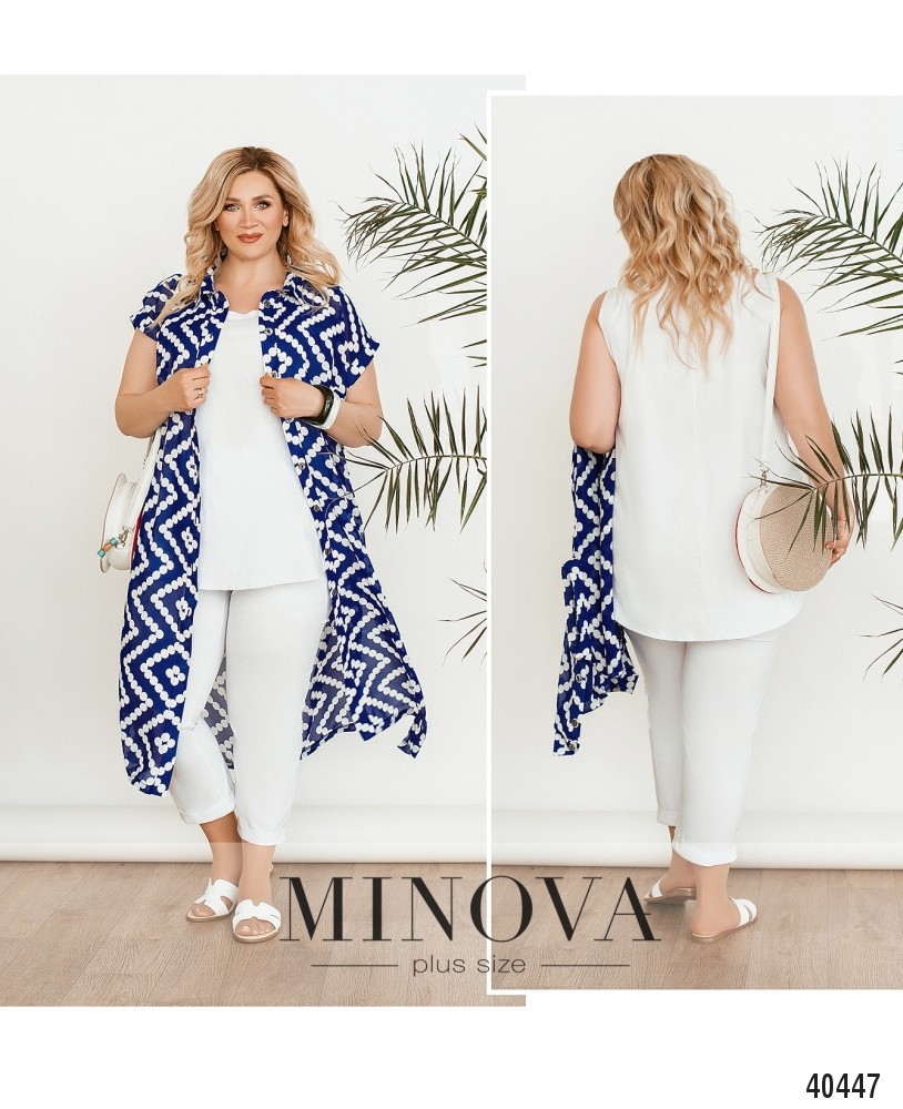 Стильный, лёгкий и комфортный костюм-тройка большого размера, в комплекте лёгкая полупрозрачная накидка с рядом пуговиц спереди на планке, рукава короткие, с отворотами, карманов нет, по бокам подола - разрезы. Футболка без карманов и застёжек. Брюки с высокой талией, в пояс вшита резинка, без манжет.