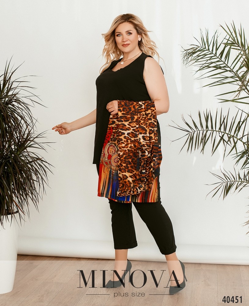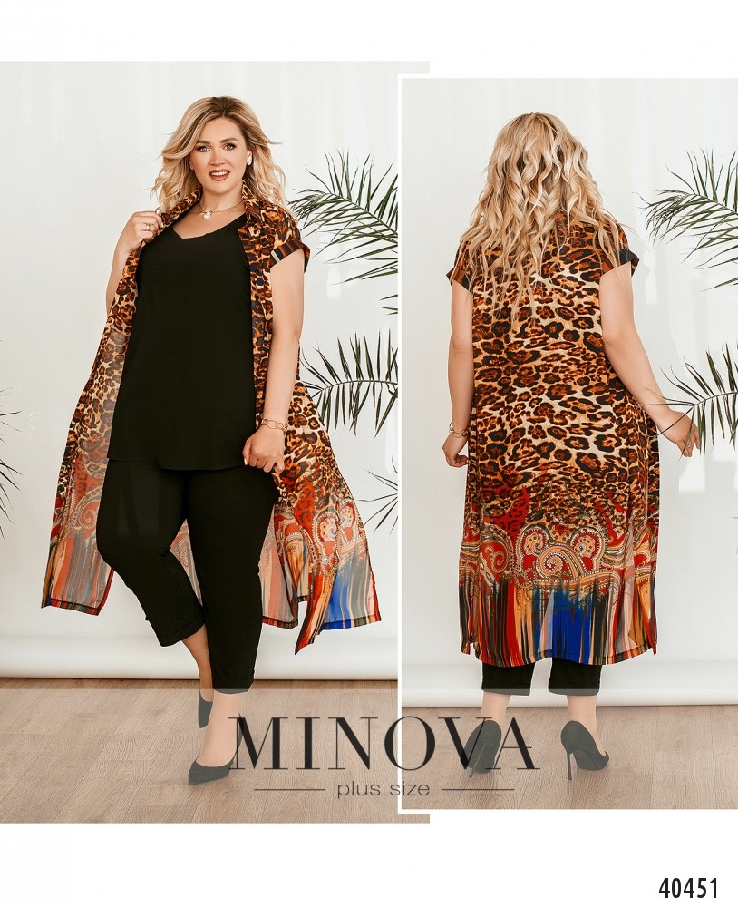 Стильный, лёгкий и комфортный костюм-тройка большого размера, в комплекте лёгкая полупрозрачная накидка с рядом пуговиц спереди на планке, рукава короткие, с отворотами, карманов нет, по бокам подола - разрезы. Футболка без карманов и застёжек. Брюки с высокой талией, в пояс вшита резинка, без манжет.