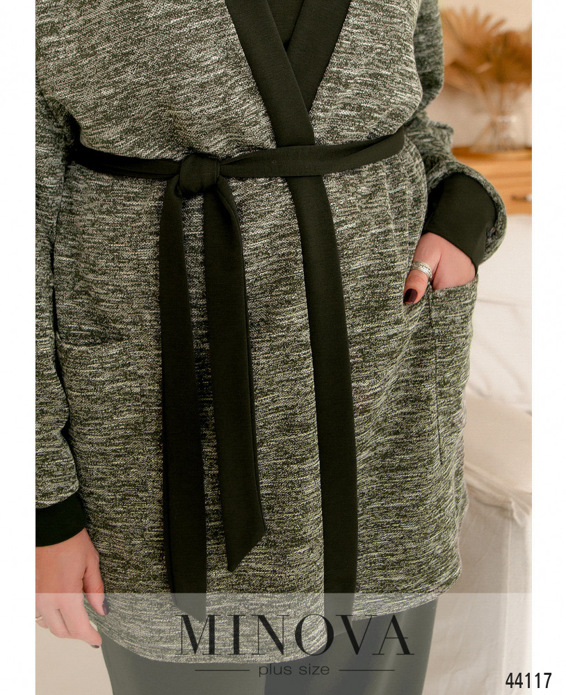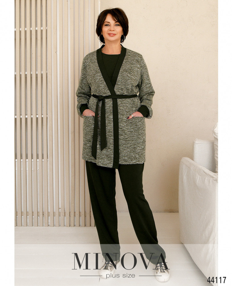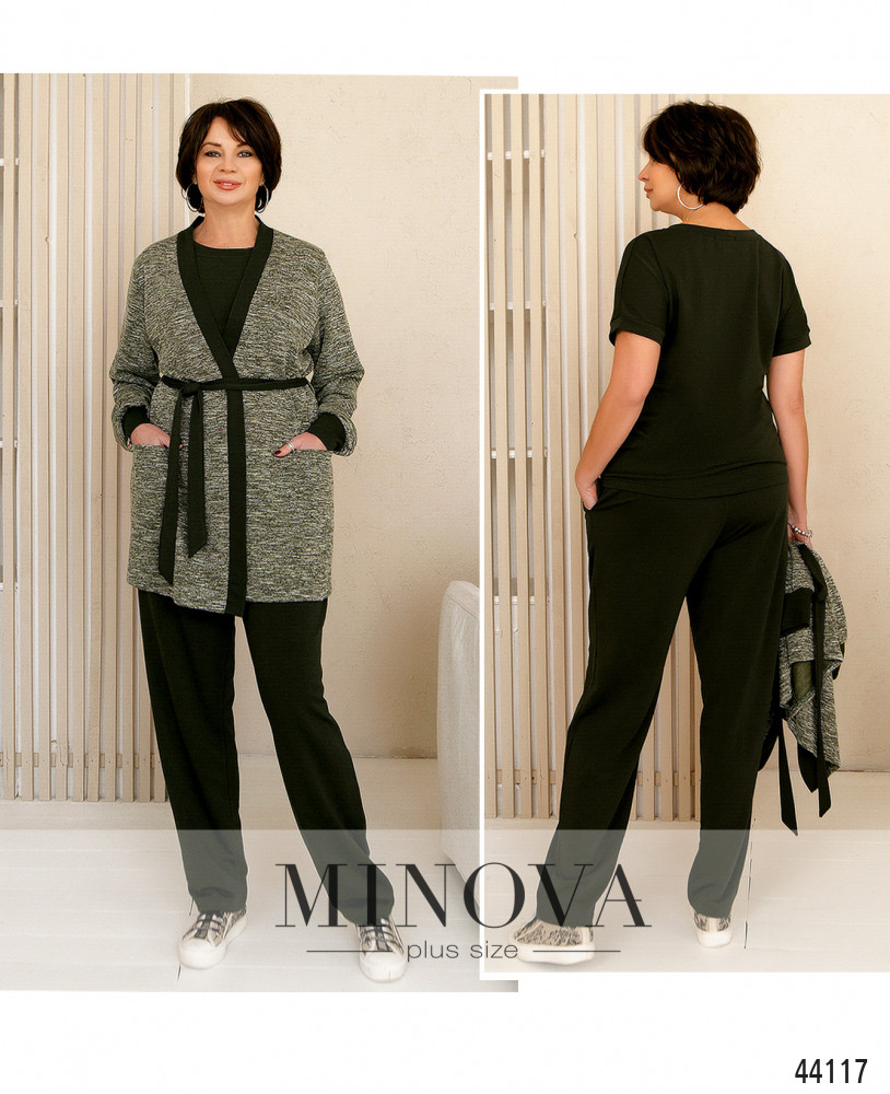 Стильный и комфортный костюм-тройка большого размера. Брюки с высокой талией, в пояс вшита резинка, по бокам - карманы в шве. Футболка без застёжек и карманов, рукава и горловина с мягким манжетом. Кардиган меланжевого оттенка с мягкой оторочкой полочек, в наличии пояс в тон и шлейки для него на талии. Без застёжек и подкладки, спереди накладные карманы.
