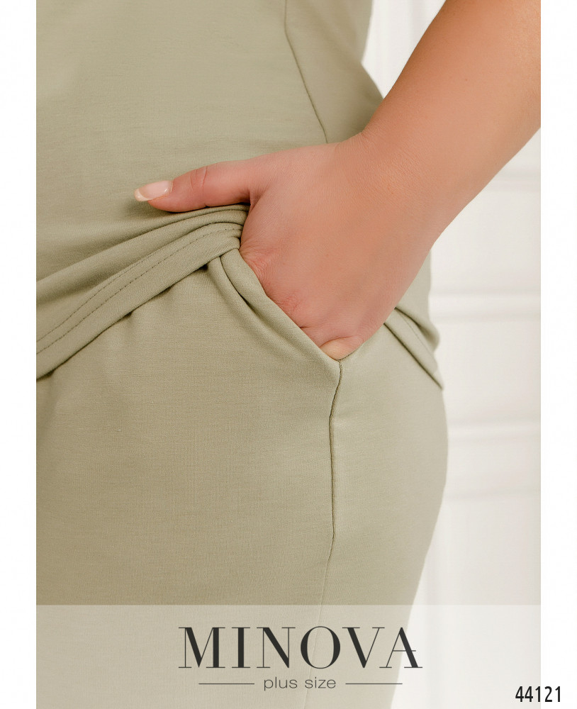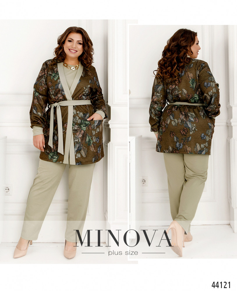 Стильный и удобный костюм-тройка батал. Брюки с высокой посадкой, в пояс вшита резинка, по бокам - карманы в шве. Футболка без застёжек и карманов, с коротким рукавом, вырез горловины полукруглый, с мягким манжетом. Кардиган без застёжек, с окантовкой полочек, спереди накладные карманы, рукава с мягкими манжетами. На талии две шлейки для пояса в тон.