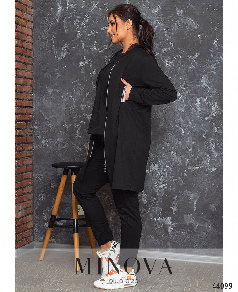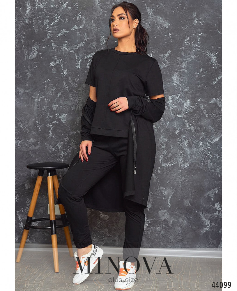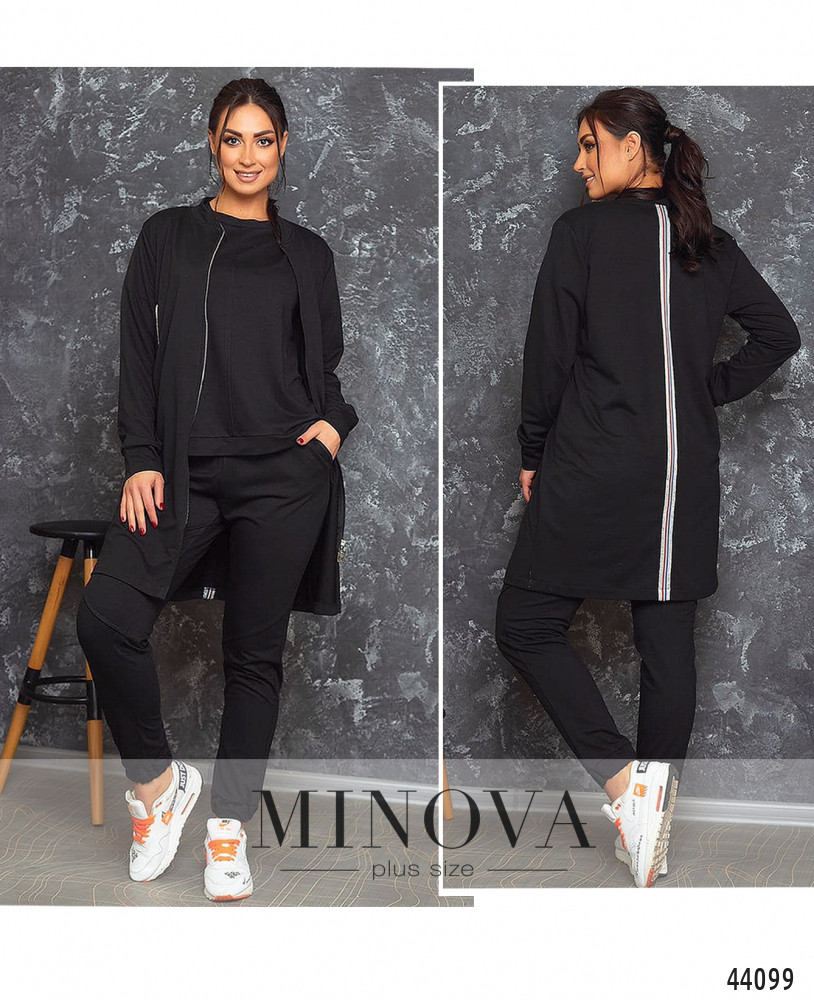 Удобный и стильный костюм-тройка плюс сайз, курточка длинная, со сквозной молнией спереди. На уровне груди - карманы в шве с цветной окантовкой, на спинке - длинная продольная лента. Рукава с мягкими манжетами. Футболка с манжетом на подоле и горловине, без застёжек и карманов. Брюки с высокой талией, по бокам карманы, в пояс и в манжеты вшита резинка. На бёдрах декоративные диагональные швы.