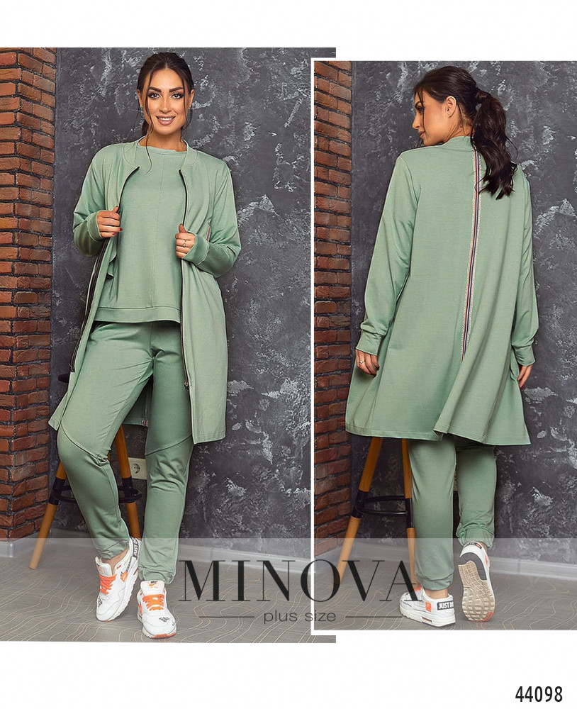 Удобный и стильный костюм-тройка плюс сайз, курточка длинная, со сквозной молнией спереди. На уровне груди - карманы в шве с цветной окантовкой, на спинке - длинная продольная лента. Рукава с мягкими манжетами. Футболка с манжетом на подоле и горловине, без застёжек и карманов. Брюки с высокой талией, по бокам карманы, в пояс и в манжеты вшита резинка. На бёдрах декоративные диагональные швы.