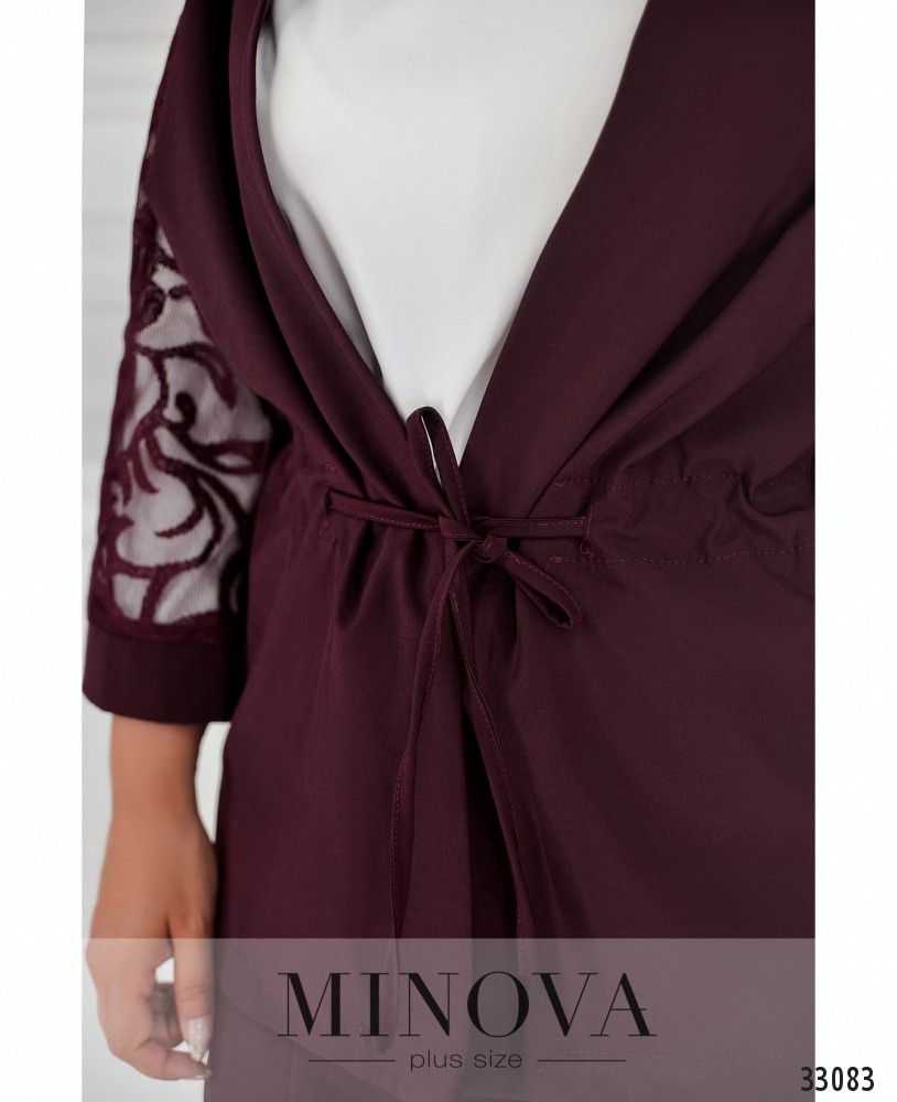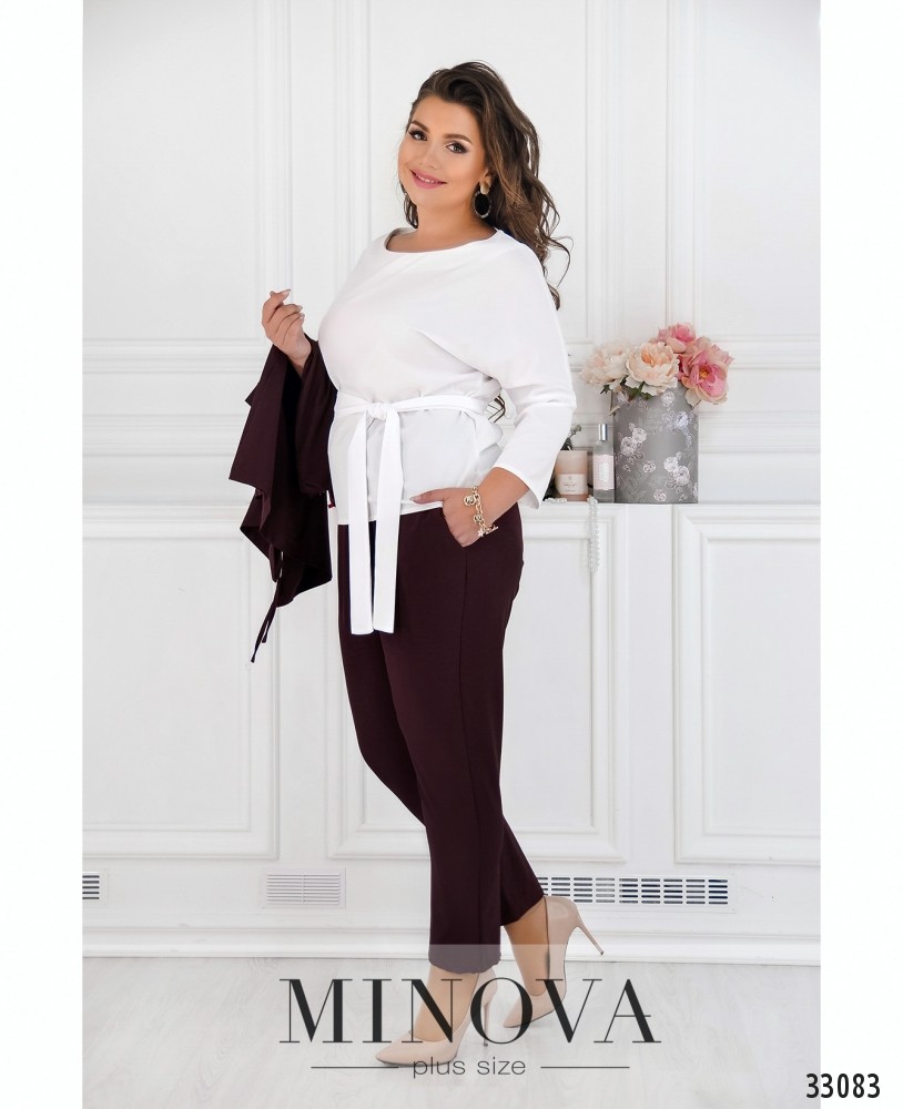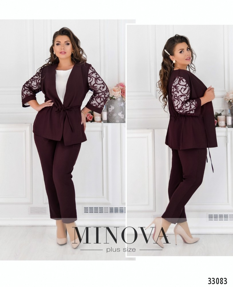 Нежный и элегантный костюм-тройка из каталога женской одежды от Minova вполне подойдёт для не слишком строгого офисного дресс-кода: цвета очень сдержанные, глубокие – синий, чёрный, бордо. В комплект входят брюки с удобной широкой резинкой на поясе, в наличии карманы; блуза без застёжек с двойными рукавами длиной ¾, и женственный жакет без карманов со вшитым поясом и гипюровыми рукавами. Крой полочек жакета полукруглый, без бортов. Ткань мягкая, приятная к телу, не тянется. Костюм такого фасона будет хорошо смотреться на любом типе фигуры.