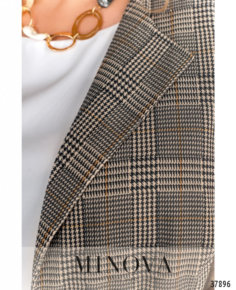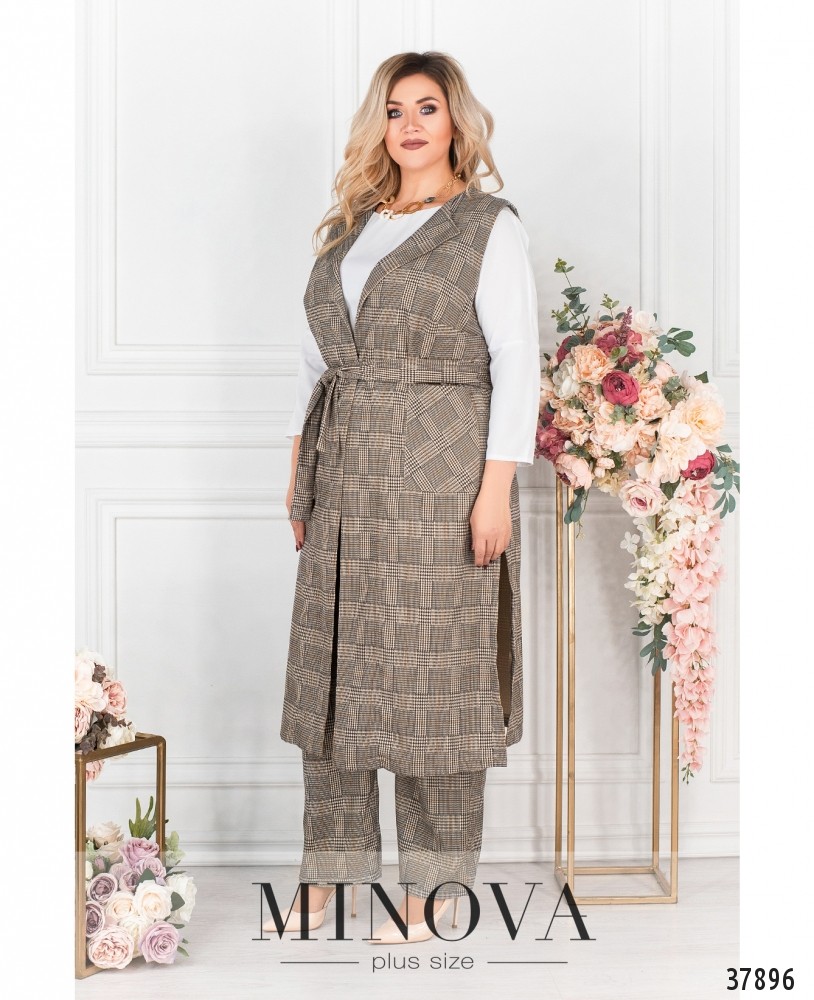 Стильный костюм-тройка батал с брюками, жилеткой и рубашкой. Брюки высокой посадки, в пояс вшита резинка, по бокам карманы. Рубашка без застёжек и карманов, с полукруглым вырезом горловины. Жилетка длинная, без застёжек, в комплекте пояс, по бокам – накладные карманы.