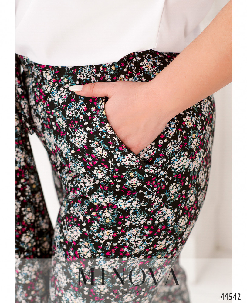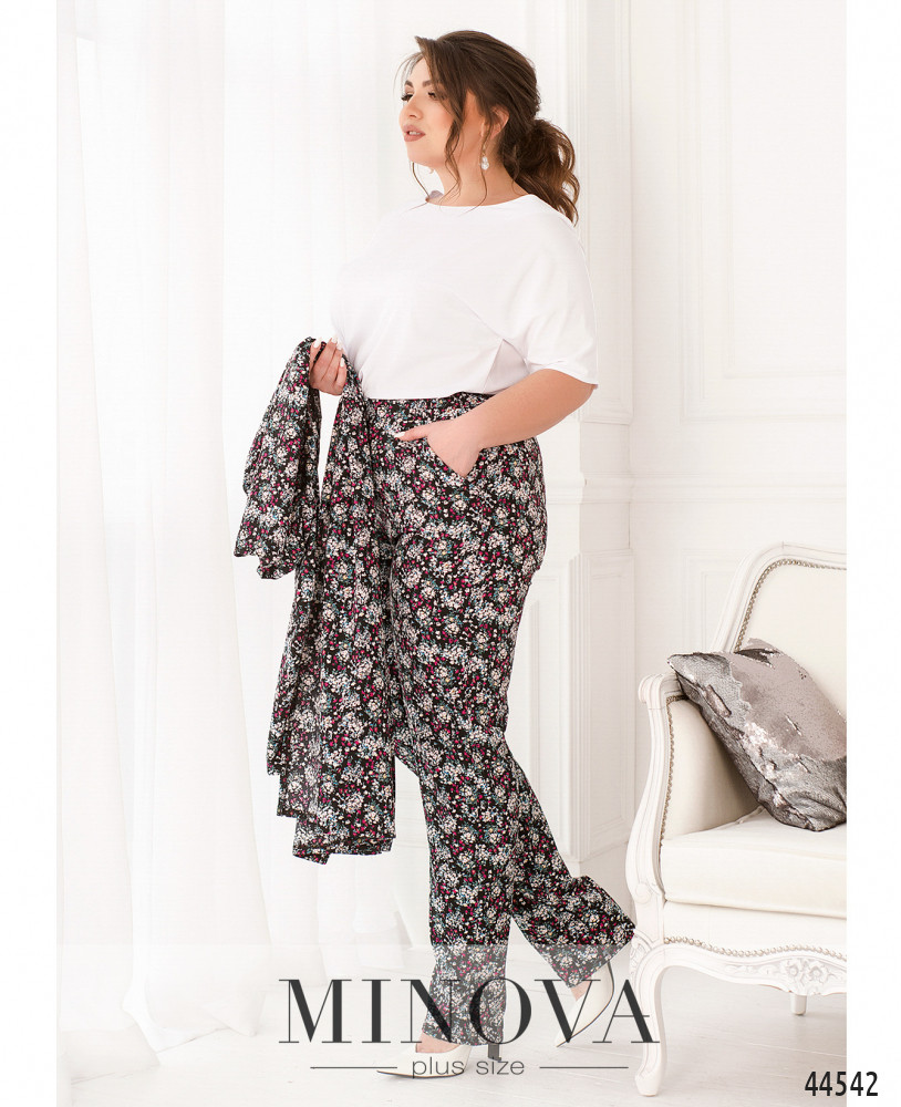 Яркий и оригинальный костюм-тройка батал. Кардиган без застёжек и карманов, рукава без манжет, на подоле по бокам очень длинные разрезы. Футболка с коротким рукавом, вырезом горловины "лодочка", без застёжек и карманов. Брюки с высокой посадкой, в пояс вшита резинка, по бокам - карманы в шве, застёжек нет.