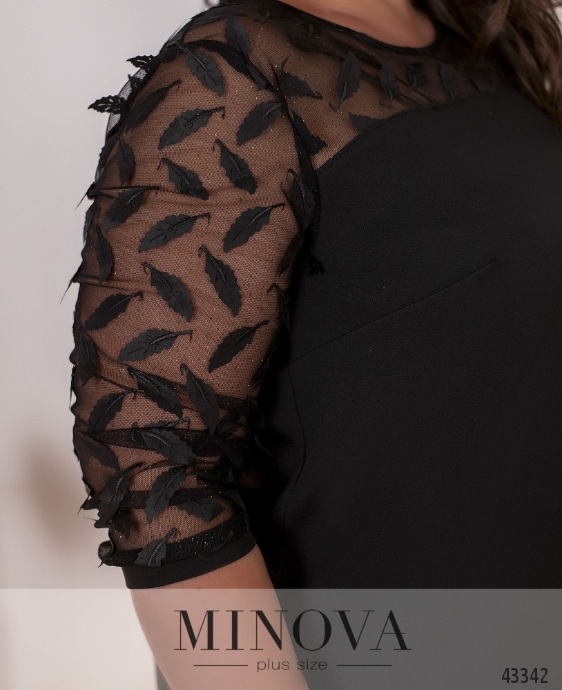 Привлекательный костюм-двойка плюс сайз, рукава и верх блузы - из полупрозрачной сеточки, украшенной аппликациями-листьями. Застёжка - молния, вшитая по спинке. На груди вытачки, карманов нет. Брюки со вшитой в пояс сзади резинкой, посадка высокая, карманов нет.