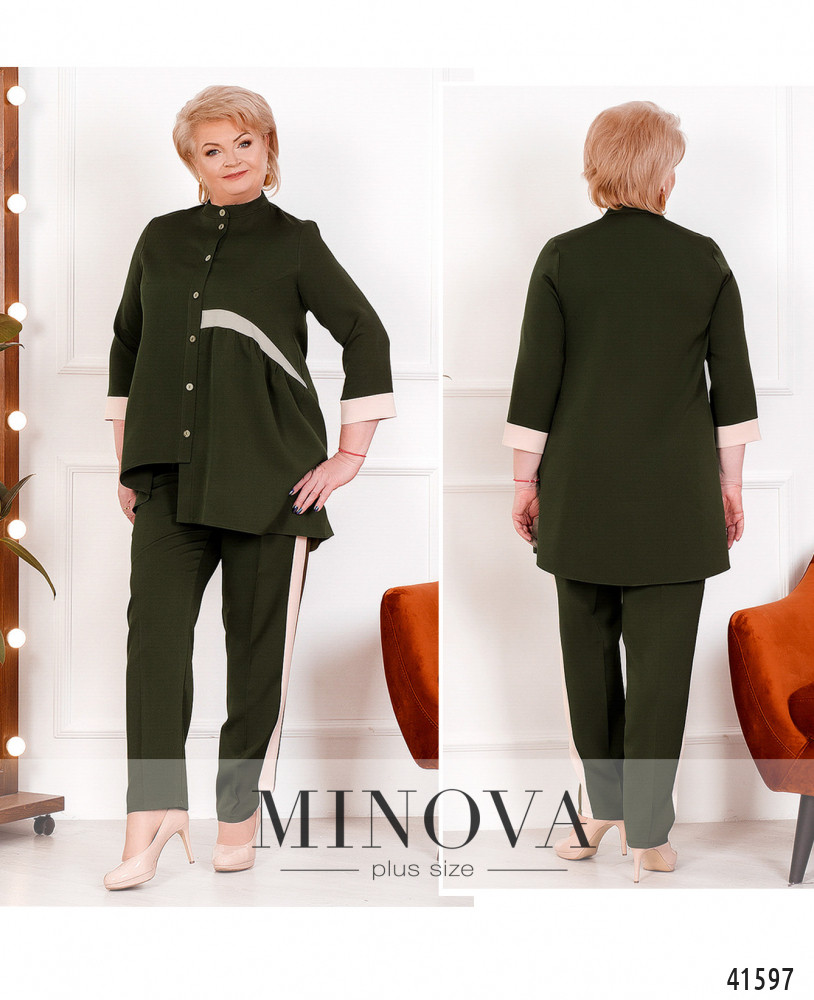 Стильный и элегантный костюм-двойка батал с оригинальной блузой. Блуза с асимметричным подолом: слева чуть длиннее. Слева на талии лента, от неё подол ниспадает мягкими оборками. Карманов нет. Застёгивается на ряд пуговиц от небольшого воротника до подола. Брюки с пуговицей и молнией под ширинкой, по бокам - врезные карманы и контрастные лампасы, в пояс сзади вшита резинка. Посадка высокая.