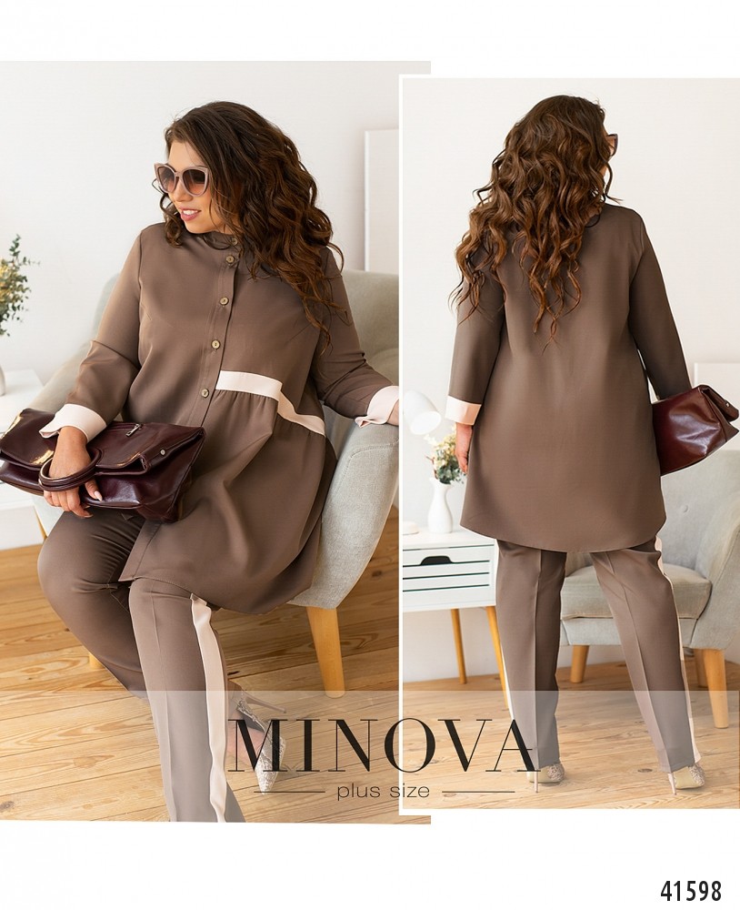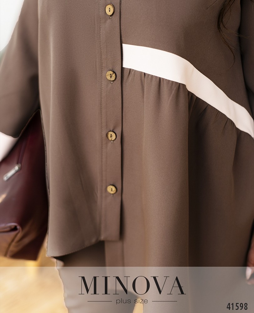 Стильный и элегантный костюм-двойка батал с оригинальной блузой. Блуза с асимметричным подолом: слева чуть длиннее. Слева на талии лента, от неё подол ниспадает мягкими оборками. Карманов нет. Застёгивается на ряд пуговиц от небольшого воротника до подола. Брюки с пуговицей и молнией под ширинкой, по бокам - врезные карманы и контрастные лампасы, в пояс сзади вшита резинка. Посадка высокая.