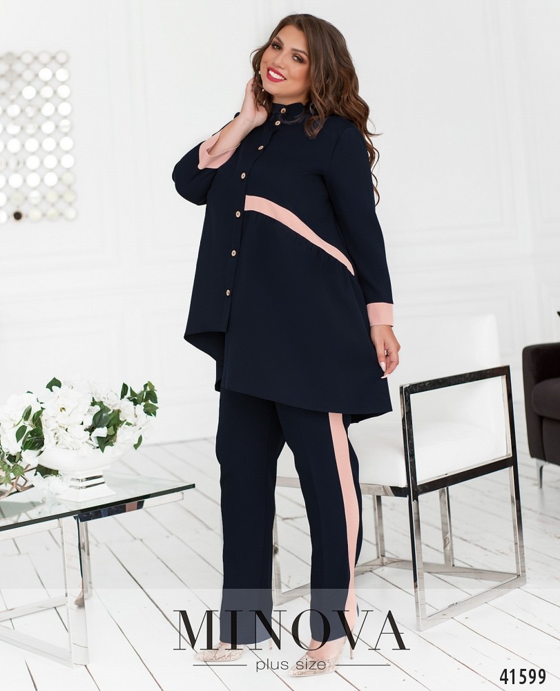 Стильный и элегантный костюм-двойка батал с оригинальной блузой. Блуза с асимметричным подолом: слева чуть длиннее. Слева на талии лента, от неё подол ниспадает мягкими оборками. Карманов нет. Застёгивается на ряд пуговиц от небольшого воротника до подола. Брюки с пуговицей и молнией под ширинкой, по бокам - врезные карманы и контрастные лампасы, в пояс сзади вшита резинка. Посадка высокая.
