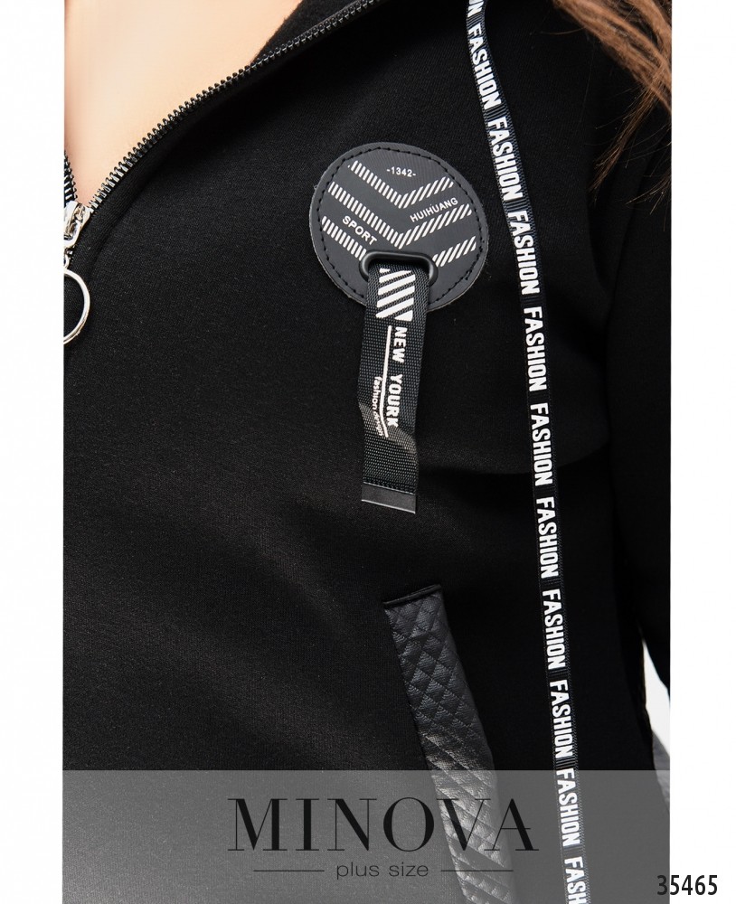 Тёплый и мягкий, из плотной ткани, полу-спортивный, полу-городской костюм-двойка от Minova представлен в свежем пополнении коллекции. В комплекте кофта и брюки. Кофта длинная, с капюшоном, рукава полной длины. По бокам – врезные карманы. Карманы и капюшон выполнены из простёганной ткани типа плащовки, и такая же ткань покрывает сзади спину от пояса до низу. Через талию по спине пропущен шнурок, который можно затянуть и приталить силуэт. На левой стороне груди – декоративный круглый элемент с ремешком. Брюки с резинкой в поясе, высокая посадка, по бокам карманы, крой прямой. Подходящий вариант для дома или для прогулок.