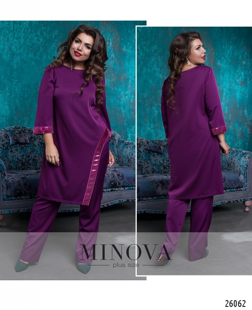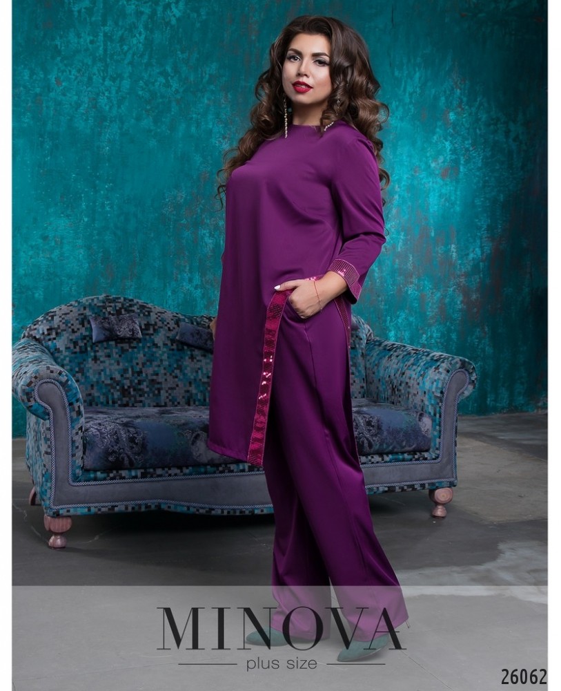 Яркий праздничный костюм-двойка с эффектными пайетками. Длинная туника с рукавами ¾ и асимметричным разрезом от бедра. Разрез и манжеты обшиты пайетками. Прямые брюки с карманами на высокой посадке. Пояс брюк представлен планкой на лицевой стороне и резинкой – на спинке. Линия шага оформлена декоративной ширинкой.