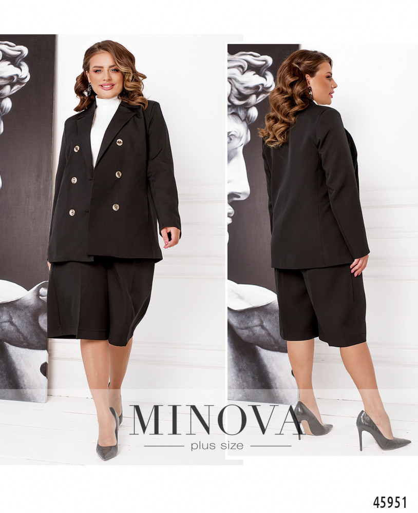 Минималистичный и в то же время оригинальный костюм-двойка батал. Пиджак двубортный с лацканами, застёгивается на ряд пуговиц. Рукава без пуговиц. На груди вытачки. В наличии подкладка и подплечники. Шорты со вшитой сзади в пояс резинкой, спереди - пуговица и молния под ширинкой. По бокам - врезные карманы.