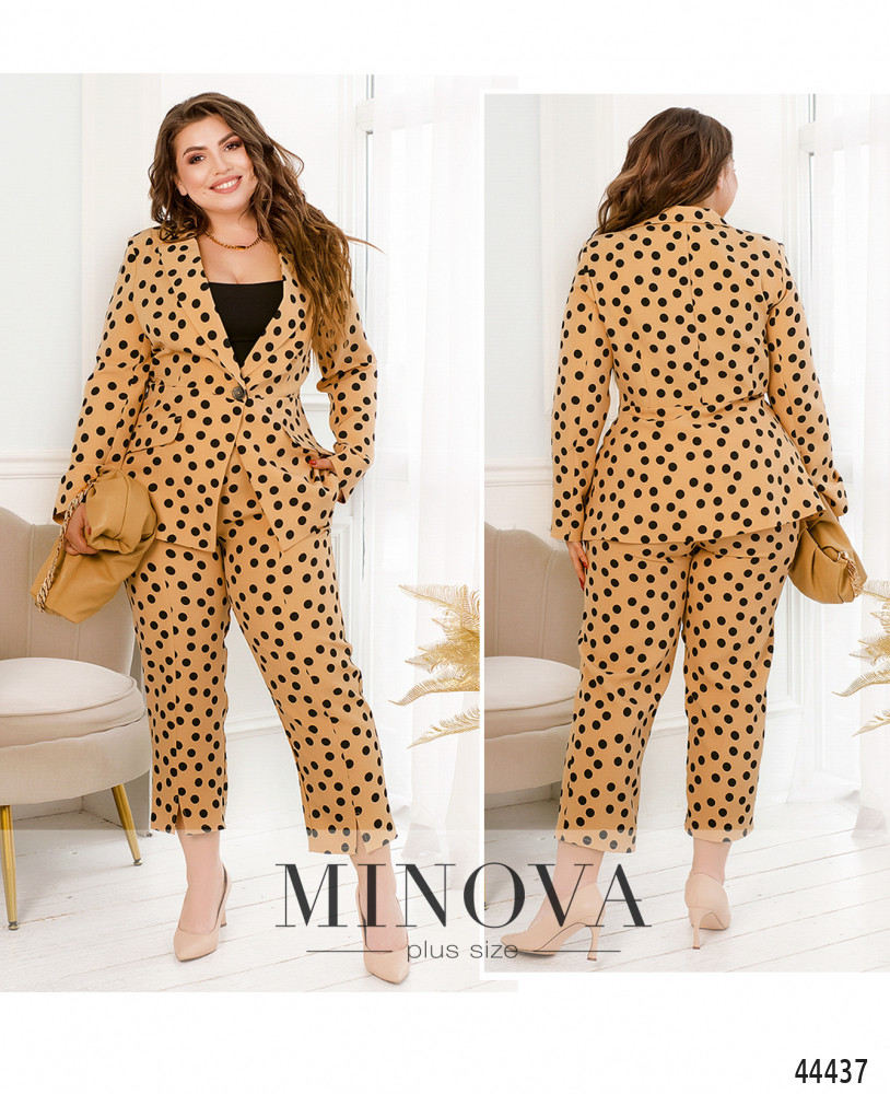 Яркий и оригинальный костюм-двойка батал. Пиджак с резными лацканами, без подкладки, рукава без пуговиц. Спереди - декоративные клапаны, карманов нет. Однобортный, застёгивается на одну пуговицу. Подол отрезной, на талии спереди продольные вытачки вверх, к груди. Есть подплечники. Брюки со вшитой сзади в пояс резинкой, посадка высокая, по бокам - карманы в шве, на бёдрах сзади декоративные клапаны.