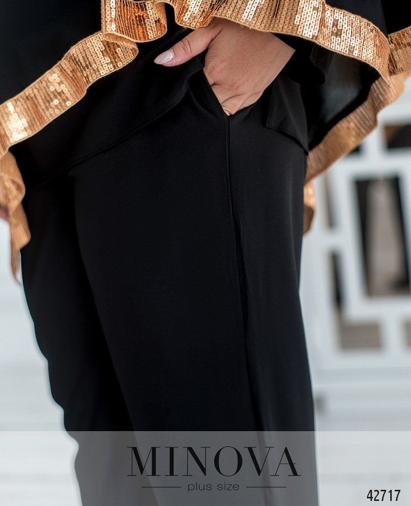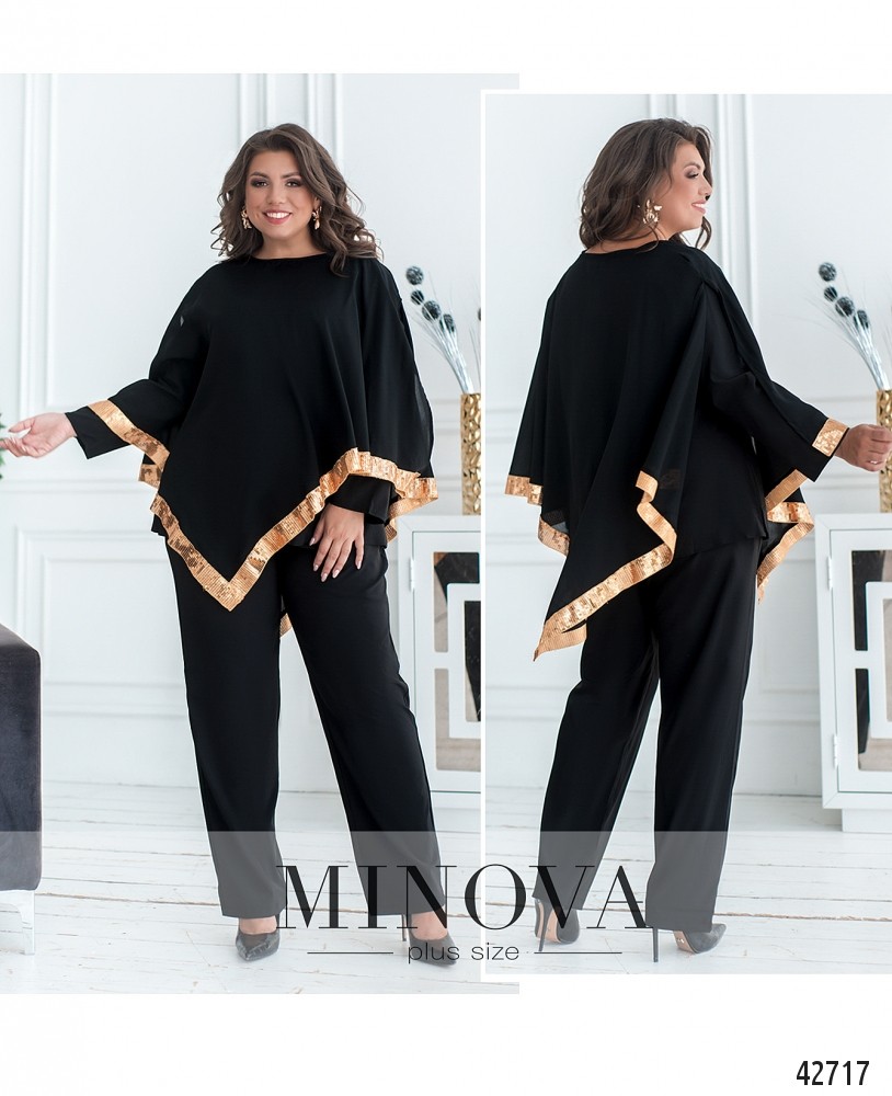 Стильный костюм-тройка батал с накидкой. Накидка полупрозрачная, от плеча - длинные разрезы, без рукавов. Декорирована манжетом с пайетками с обеих сторон. Вырез горловины полукруглый, застёжек и карманов нет. Блуза без застёжек и карманов, рукава без манжет, по бокам подола - небольшие разрезы, на груди вытачки. Брюки с высокой талией, в пояс сзади вшита резинка, по бокам врезные карманы, без застёжек.