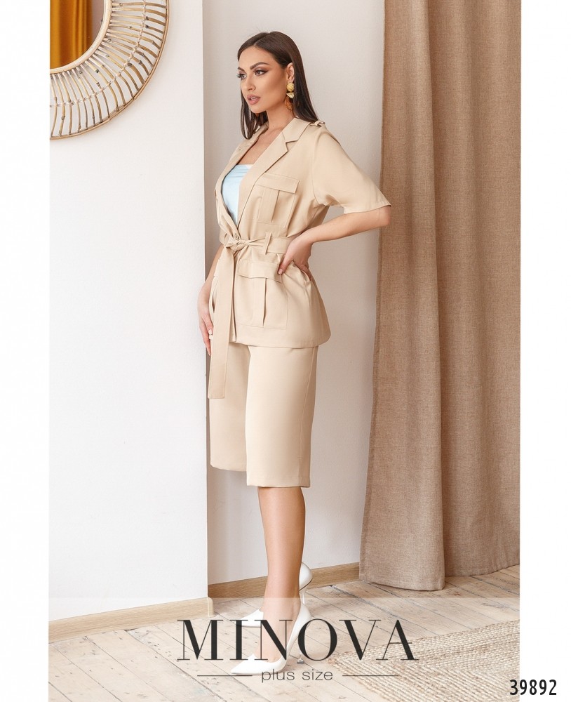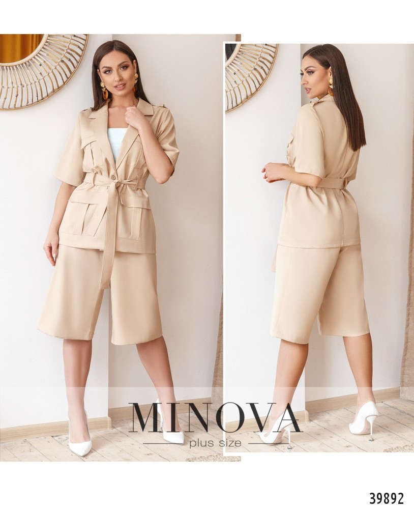 Оригинальный костюм в стиле "Индианы Джонса" - с жакетом и брюками. Брюки с высокой талией, по бокам - врезные карманы, застёгиваются на молнию под ширинкой и пуговицу. Жакет без подкладки, с накладными карманами на груди и на талии, рукава без манжет. На талии подшиты шлейки для пояса, который прилагается в комплекте. На плечах нашиты погончики.