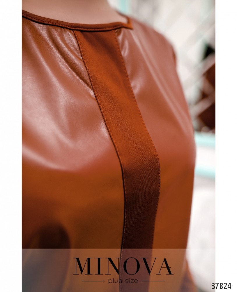 Стильный костюм-двойка с брюками и длинной кофтой. Кофта без застёжек и карманов, спереди из эко-кожи, со вставками мягкой ткани, спинка мягкая. Рукава без манжет, вырез горловины полукруглый. Брюки без карманов, высокая посадка, в пояс вшита резинка.