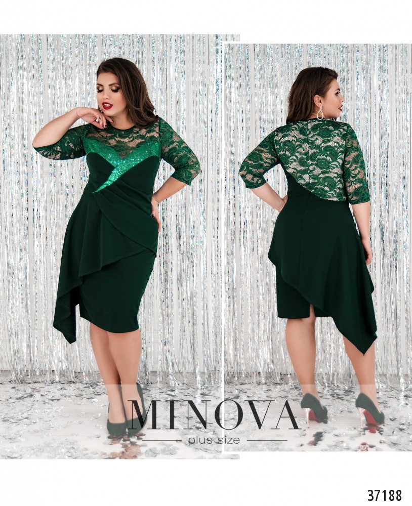 Оригинальный праздничный костюм-двойка батал. Блуза с асимметричным, сильно скошенным влево подолом, подшитым к середине спереди. Грудь декорирована широкой лентой пайеток. Сверху полупрозрачный гипюр, рукава длиной до локтя, из гипюра без подкладки. Вырез горловины полукруглый. Застёгивается на вшитую по спине молнию. Юбка прямого кроя без карманов, молния вшита по спине.